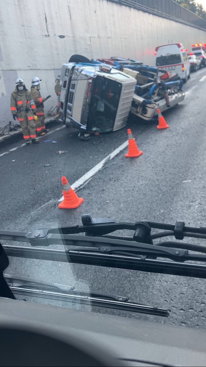 C1霞ヶ関トンネルで単独事故やってるから気おつけて。
