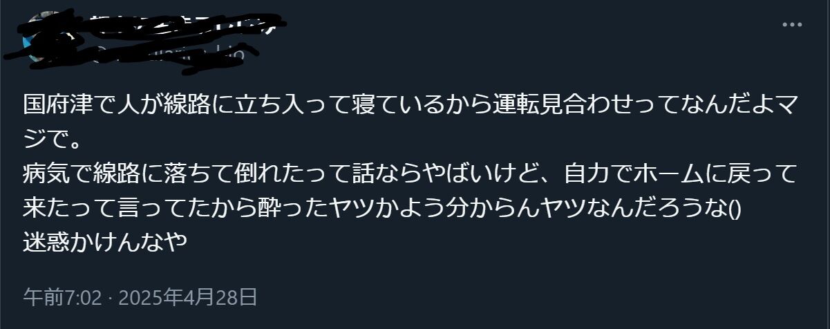 湘南新宿ラインは、東海道線内での線路に人立入の影響で、新宿駅以北の高崎線の一部列車に遅れがでています。 #湘南新宿ライン #Shonan_Shinjuku_Line https://t.co/LojididwyV— JR東日本【東海道方面】運行情報 (公式) (@JRE_F_Tokaido) April 28, 2025