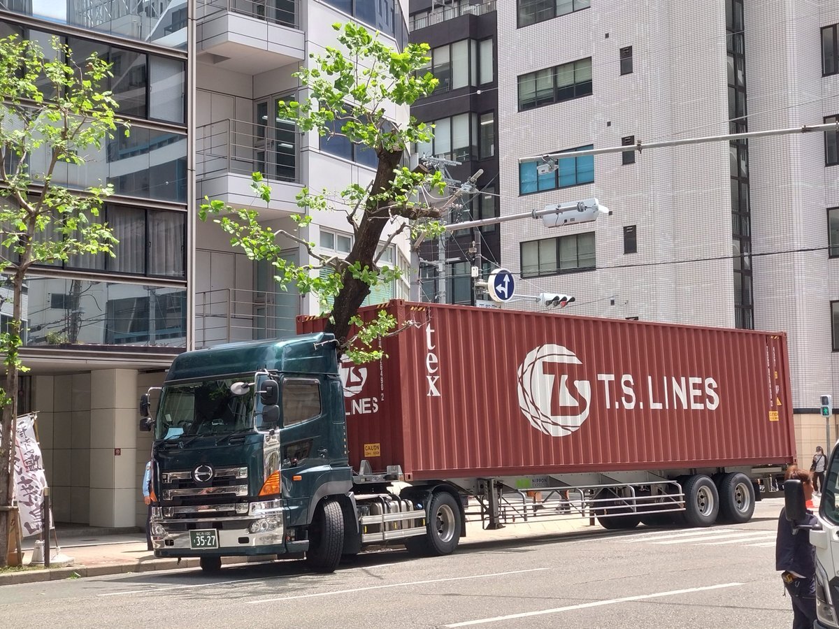 『会社近くの交差点でトレーラーが街路樹をなぎ倒してる。』