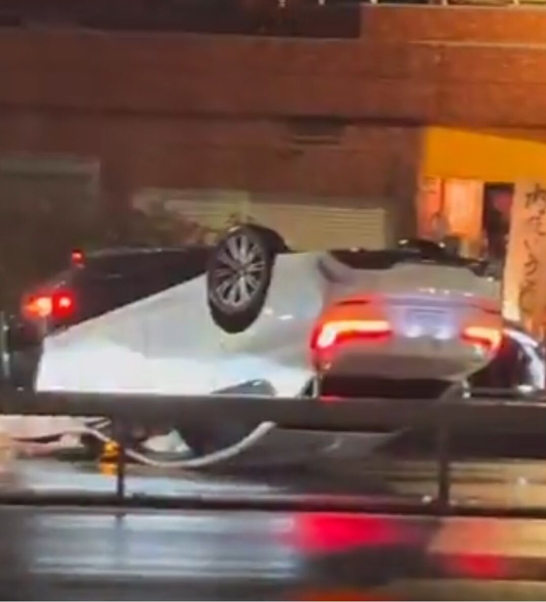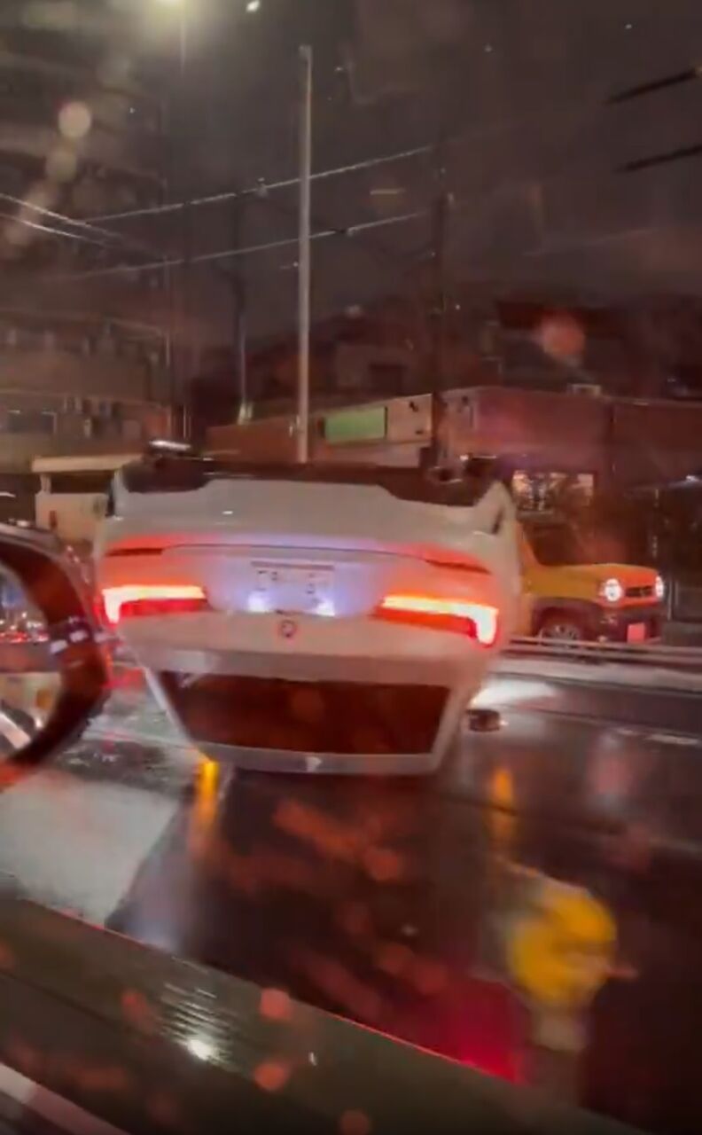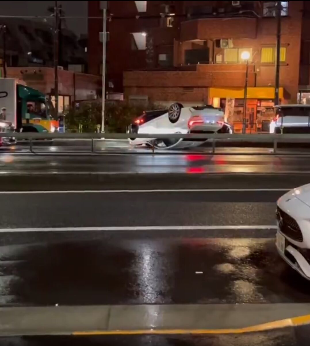 『環七内回り堀之内辺りで、ベンツがひっくり返ってます。