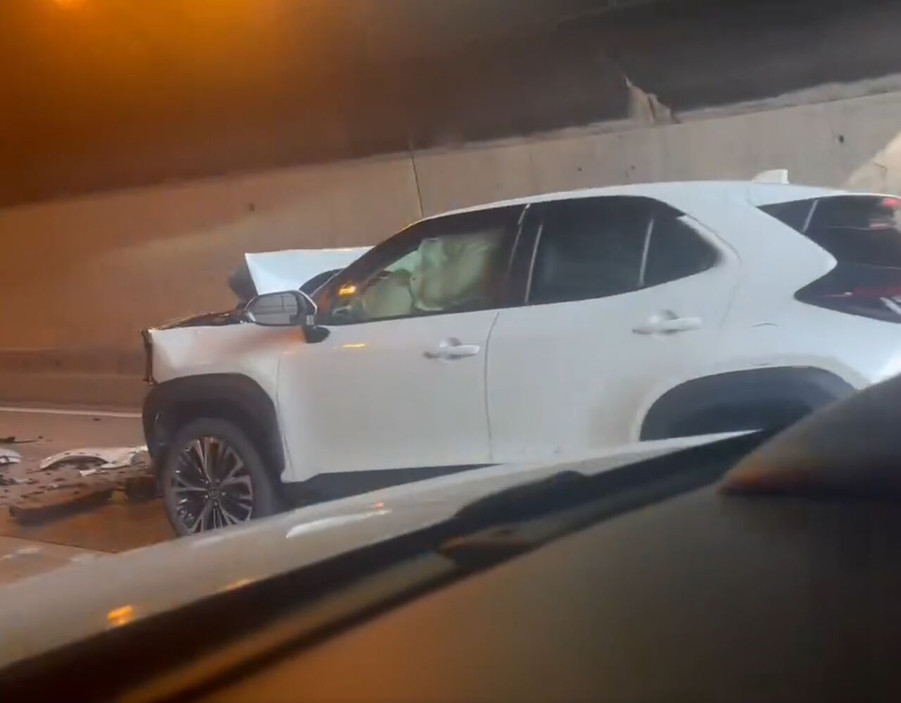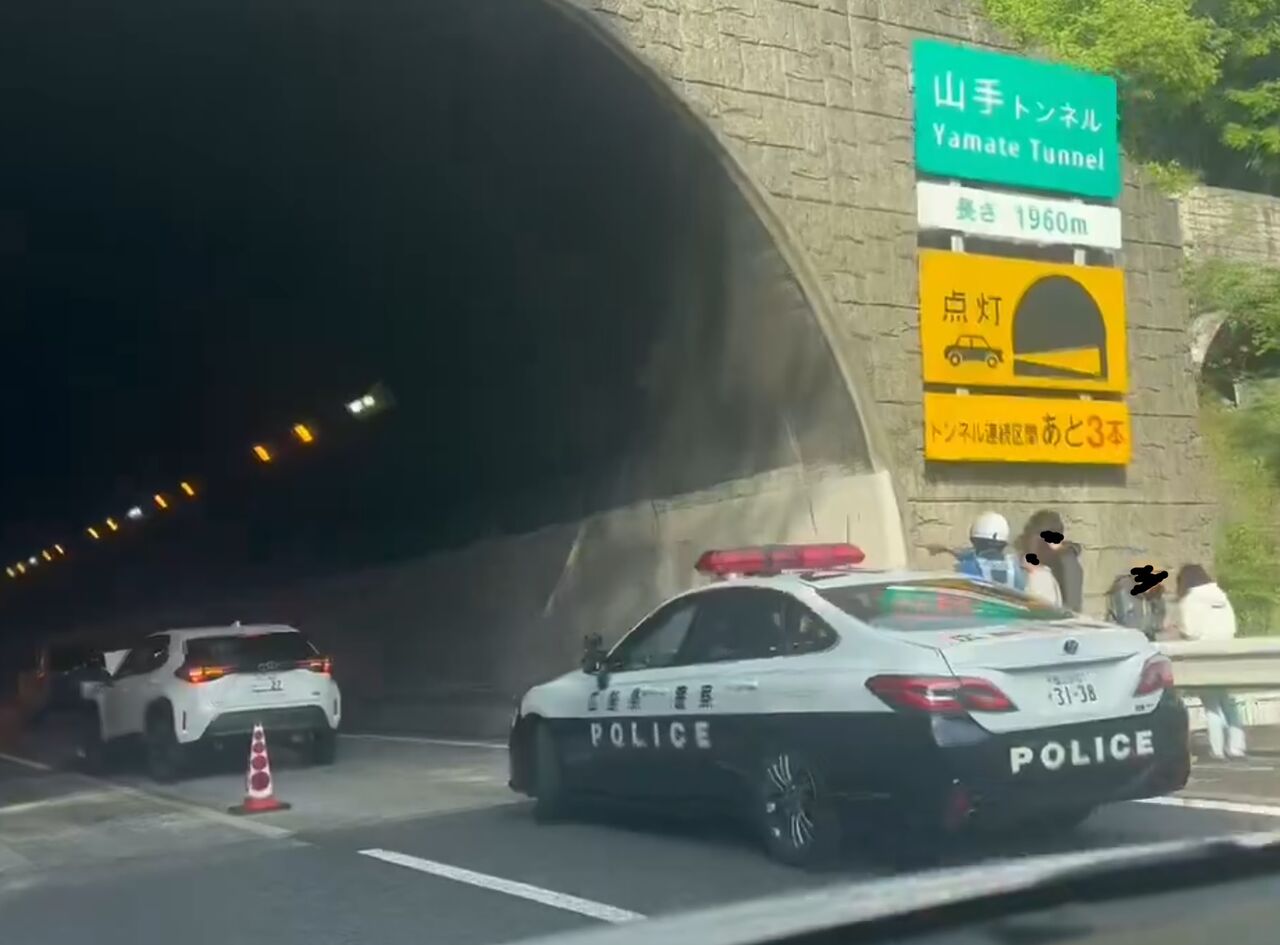 『山手トンネル入口で前面割れちゃってる車発見。その先トンネル内でぶつかったもう1台が