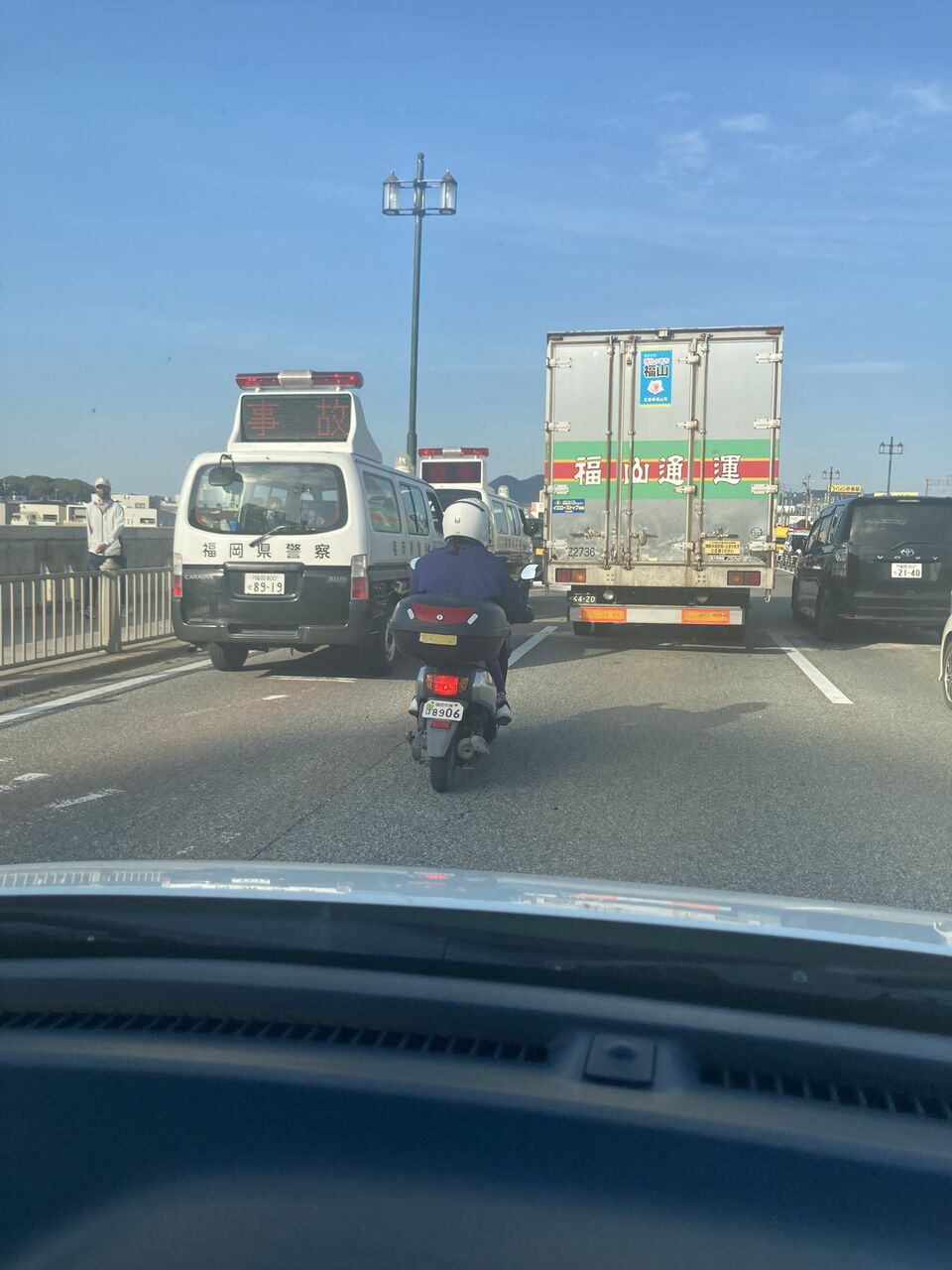 『3号線名島橋上で数台の交通事故が発生、香椎方面は渋滞発生』