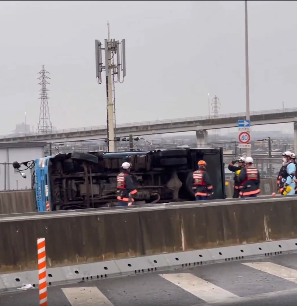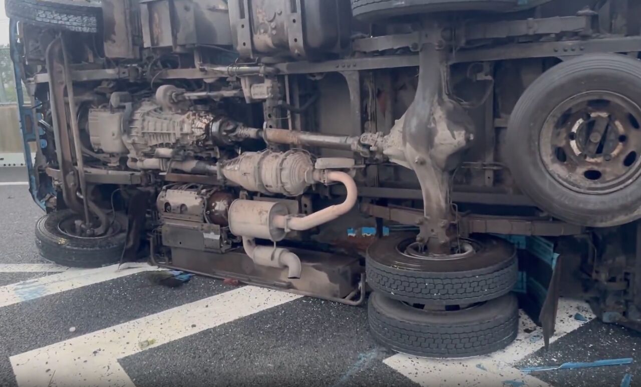 トラックが横転して車線を塞いでいる模様