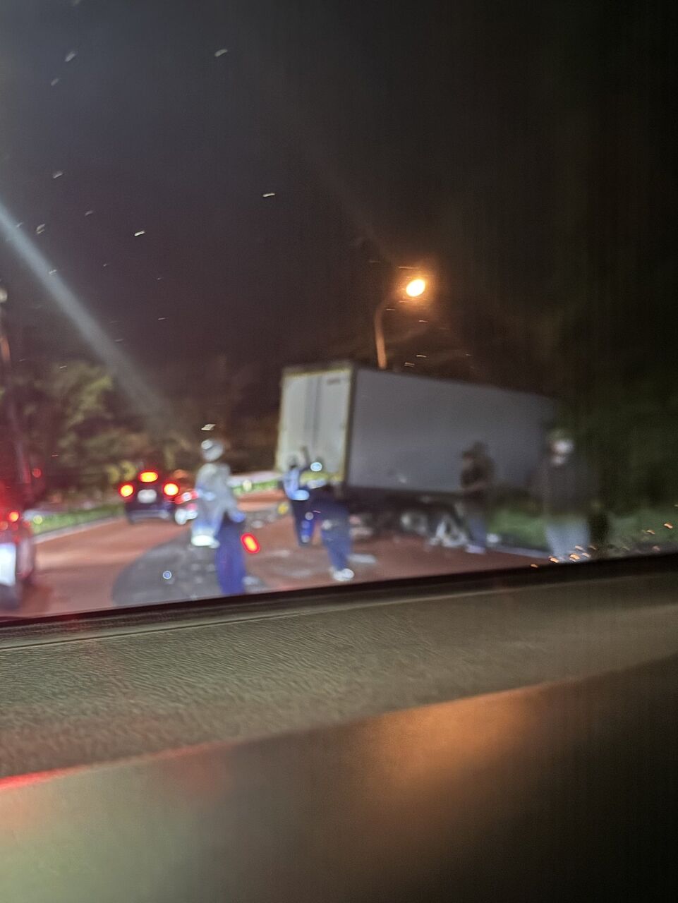 『箱根新道の小田原寄りの七曲り手前にて、トラックと乗用車が正面衝突したらしく、トラックは反対車線の崖につっこみ、乗用車は側面大破。他3台くらい巻き込まれてました。』