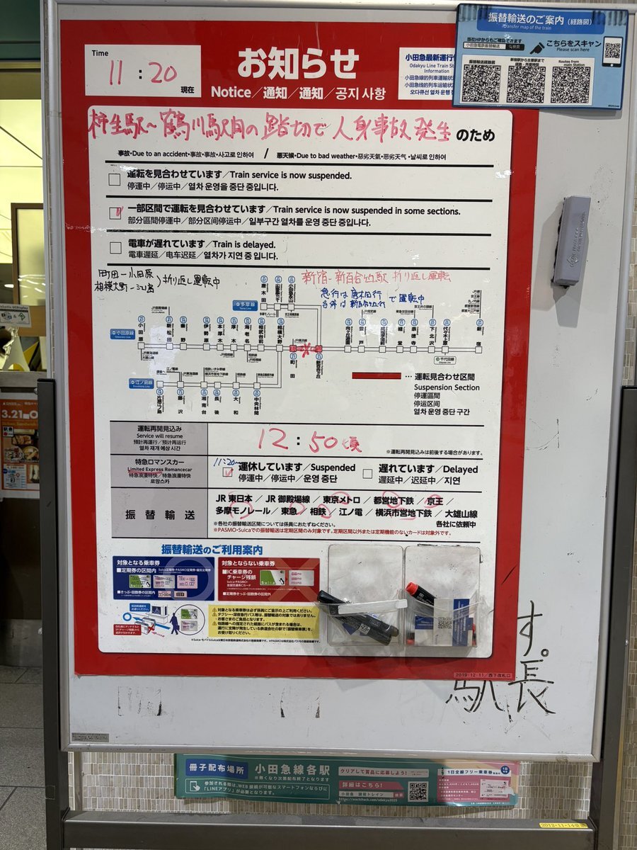 【小田急小田原線】11:14頃、柿生〜鶴川駅間で発生した人身事故の影響で、運転を見合わせててぴえん🥺 振替輸送を行ってる pic.twitter.com/b4a9r2Kg2G
