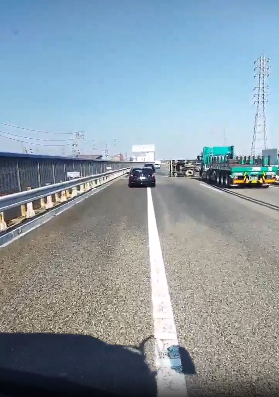 追越車線で4トントラックと大型トラック事故して4トンが横転してます』