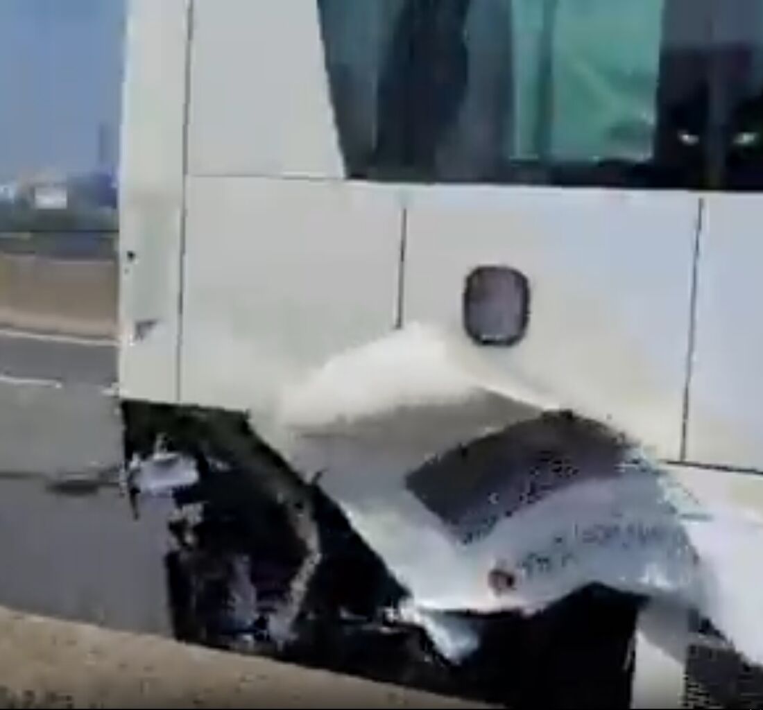 湾岸線の事故、今回は逆だけどまたダンプと観光バスで追い越し車線、今回はクシャクシャのレジャーもプラスされて大変やな