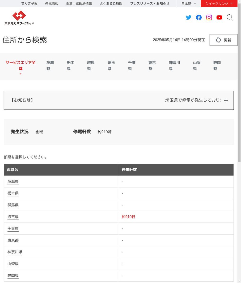 今、蕨市で停電してる?