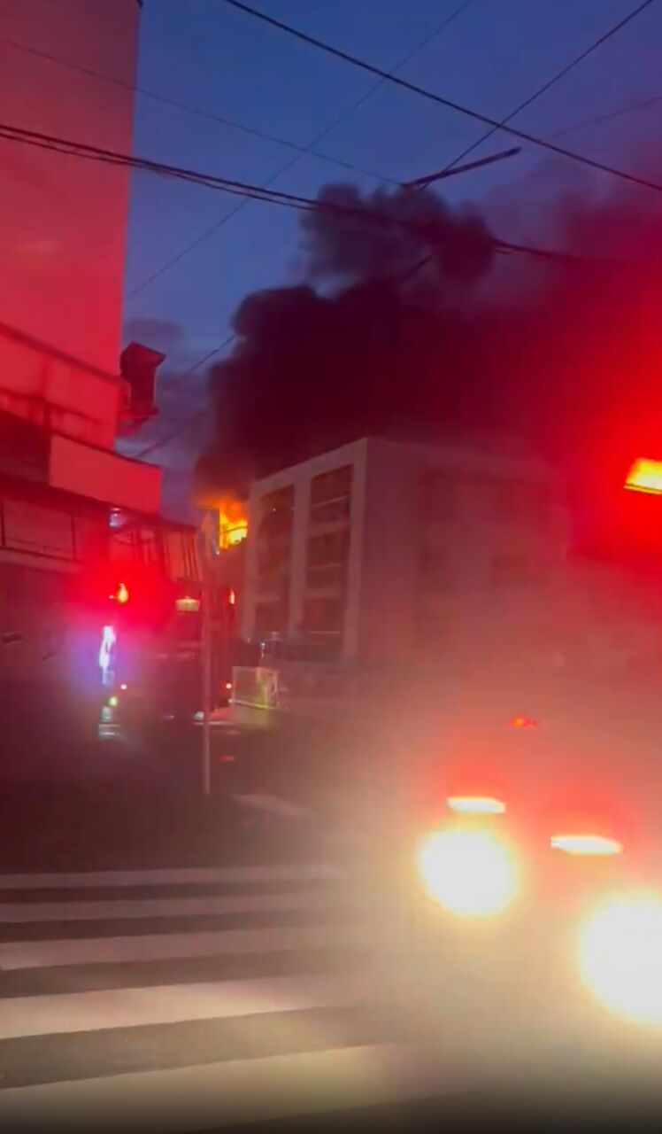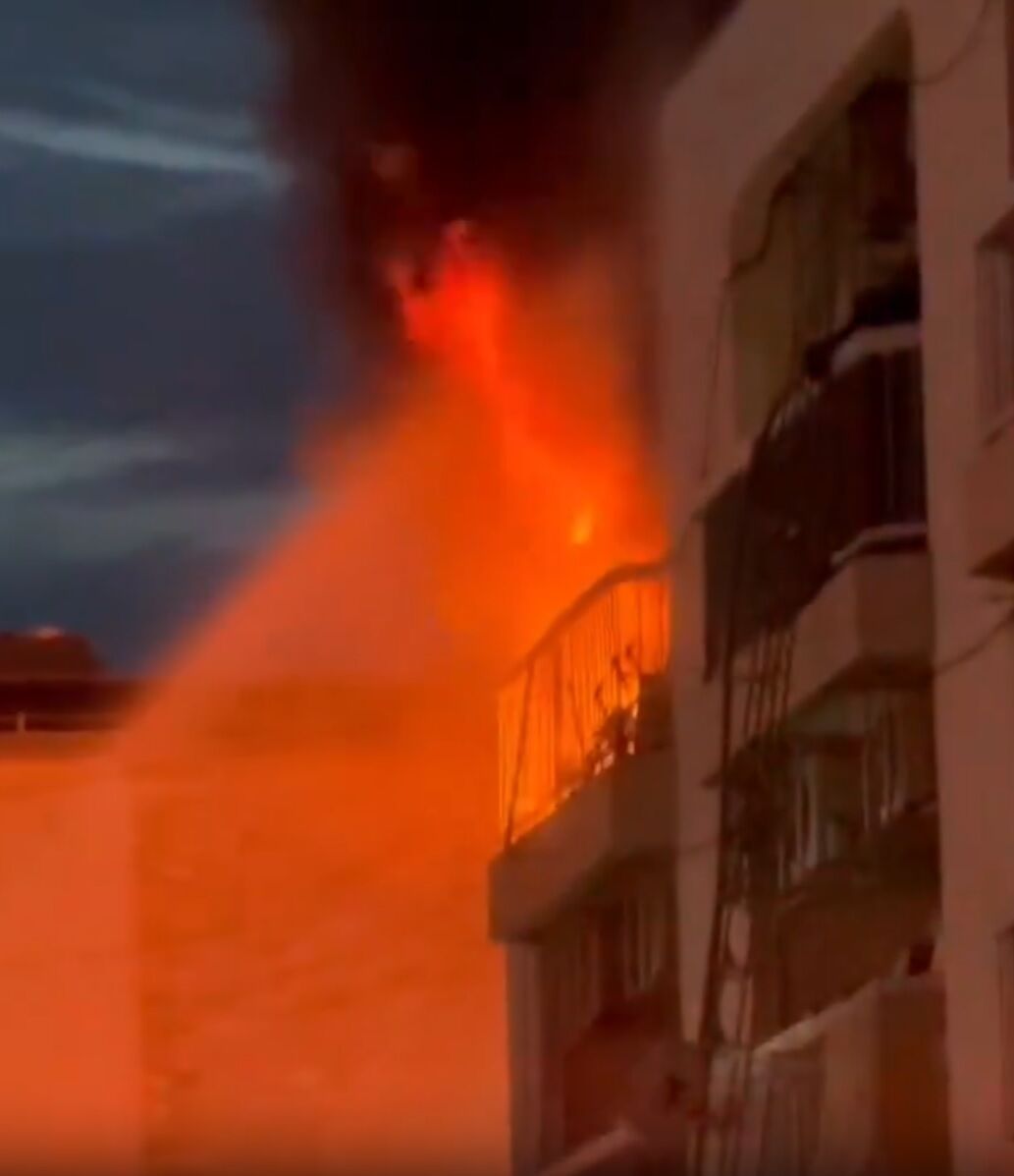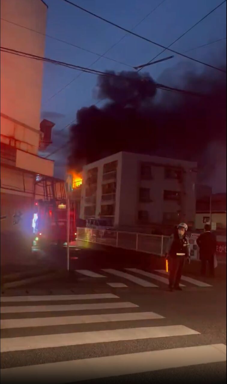 道路沿いの集合住宅建物から炎と黒煙があがっている模様
