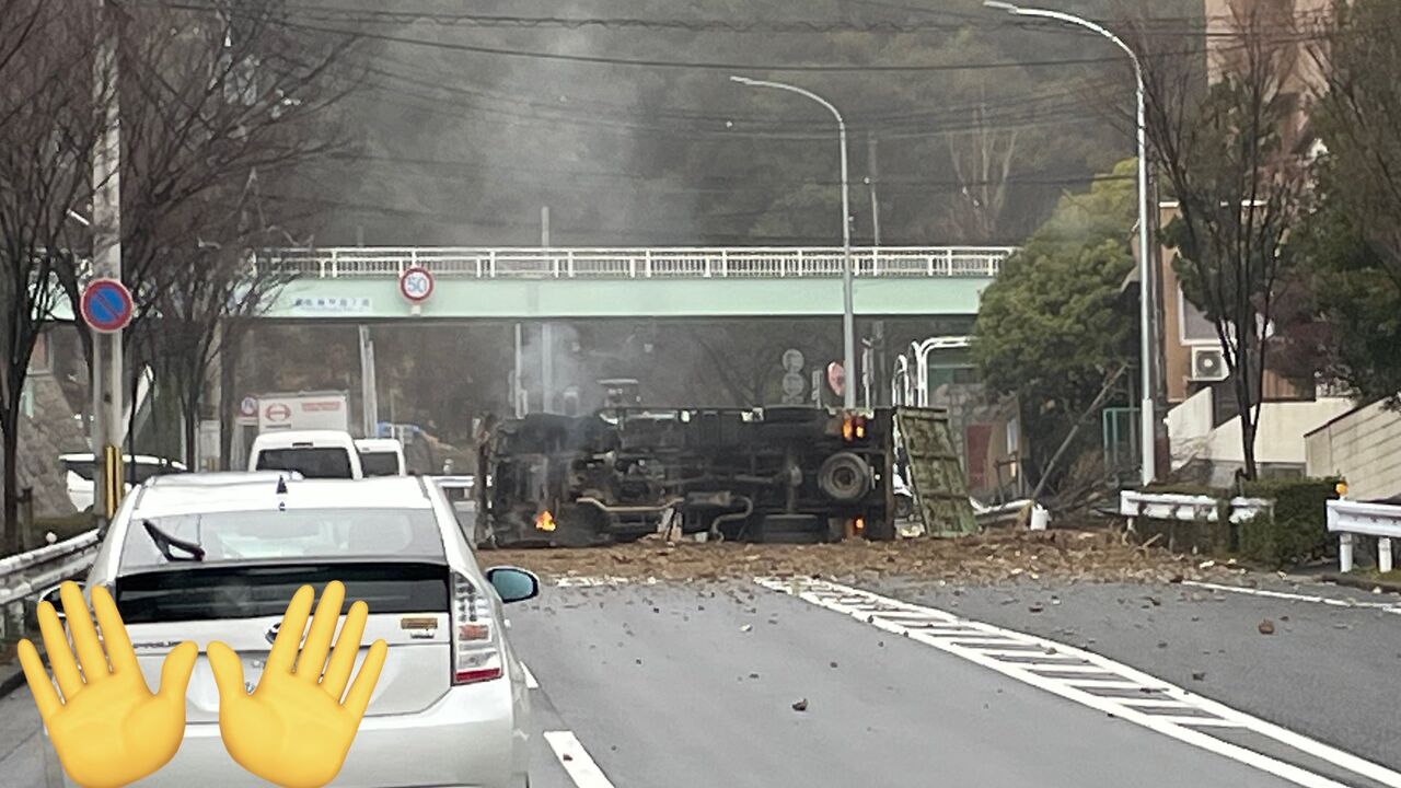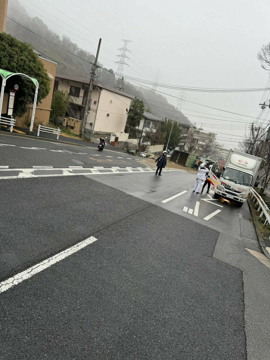 【現場の様子】#交通情報 県道95号線 兵庫県神戸市灘区鶴甲2丁目 六甲ケーブル下駅付近 積荷散乱するトラック横転事故で通行止め渋滞2月21日 #兵庫県 #神戸 #六甲山