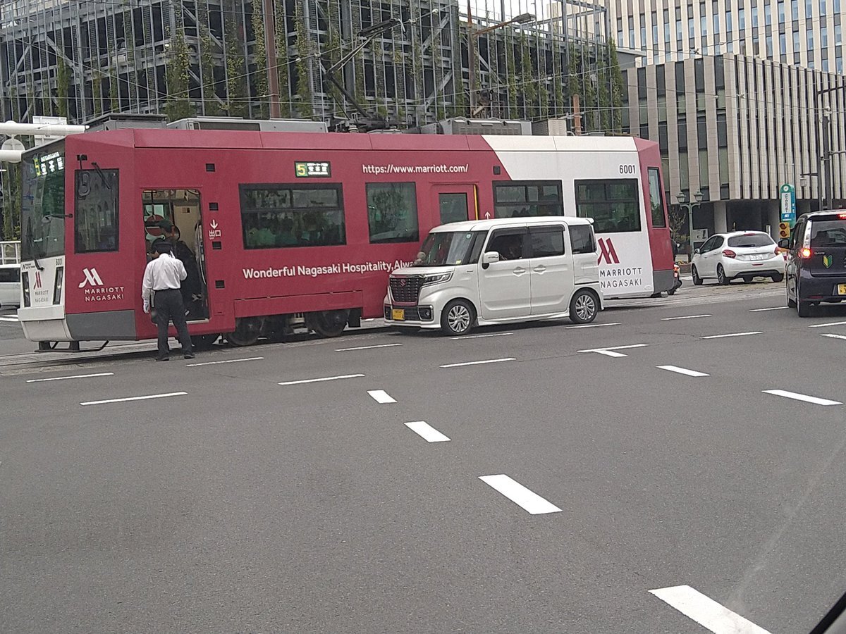 【現場の状況】#交通情報 長崎県長崎市市民病院前交差点メディカルセンター付近 路面電車と軽乗用車の接触事故で周辺道路渋滞5月16日 #長崎 #長崎電気軌道