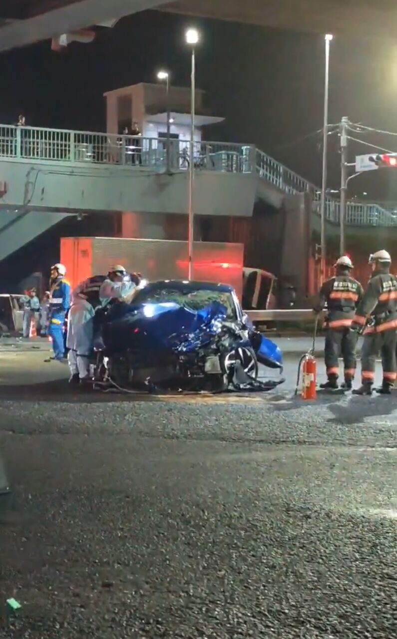 『357の若松交差点で4トンと乗用車2台事故やってます』
