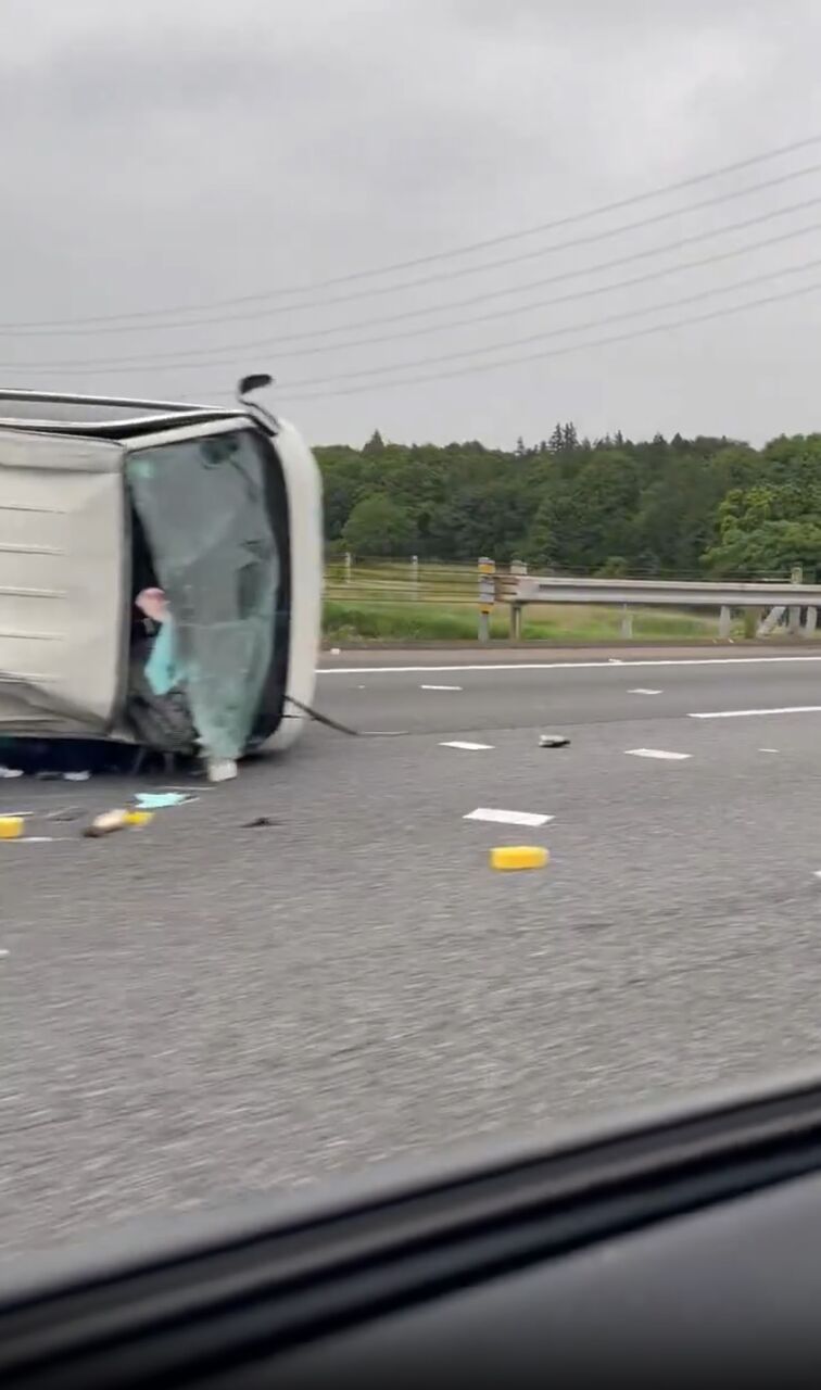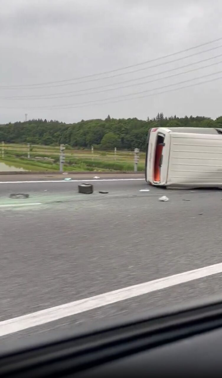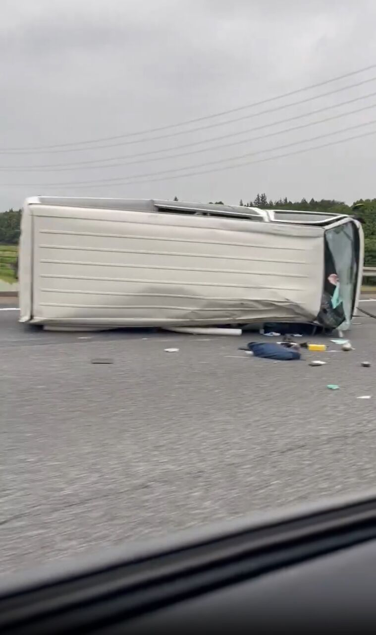 横転事故で道路を塞ぎ破片が散乱している模様