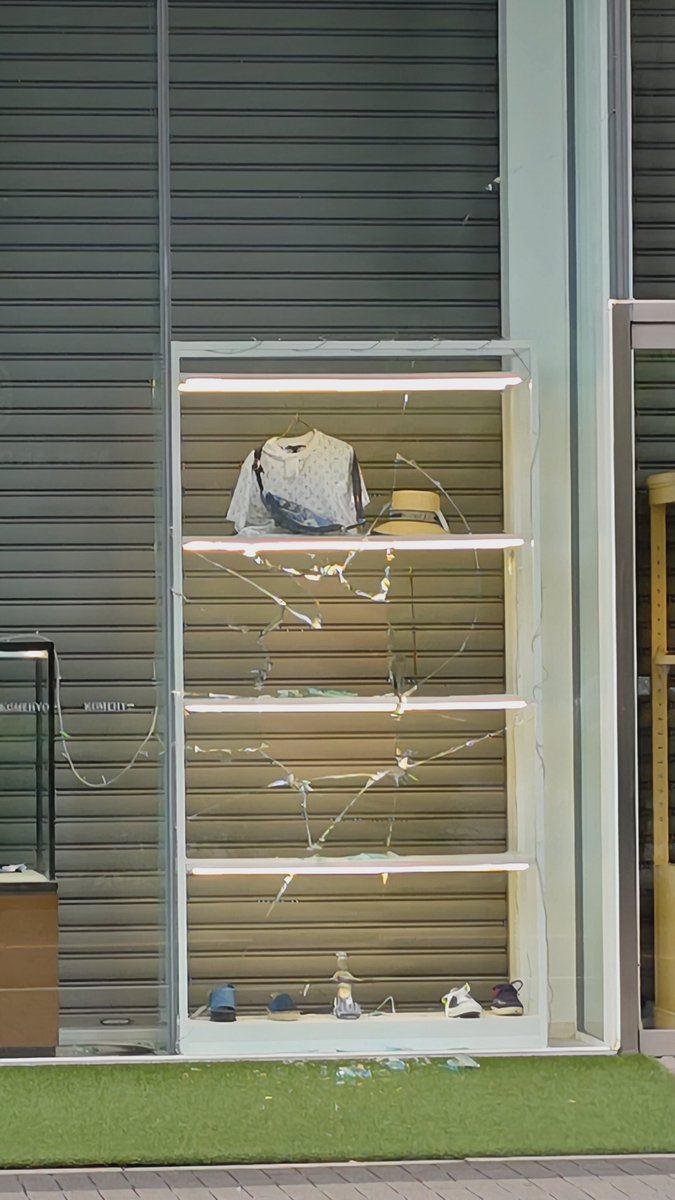店舗のシャッターは閉じられた状態ですが、入り口正面にあるショーウィンドーのガラスが割られていたということです。
