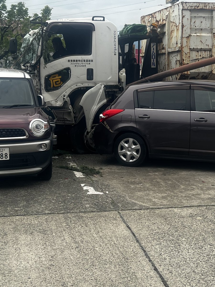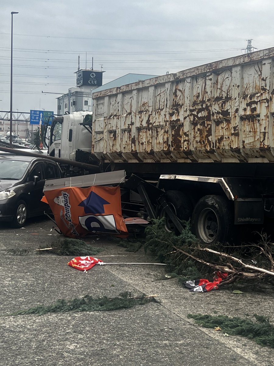 『アームロール車が標識なぎ倒し突っ込んでました。ドライバー無事なら良いんだけど』