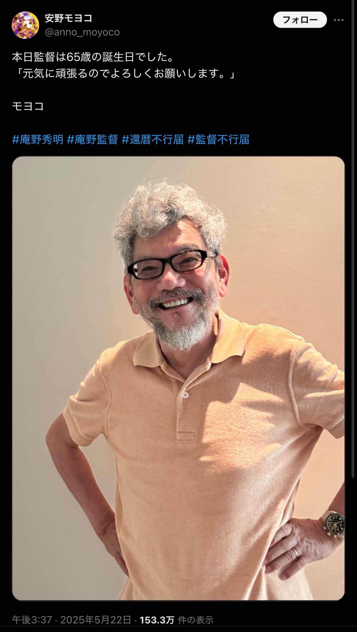 【画像】庵野秀明、65歳の誕生日を超える ←勝手にゲンドウみたいな見た目だと思ってたわwww 2025/5/24 速報 1: document.write(” + ”); 関連記事 【緊急】庵野秀明さん新作『宇宙戦艦ヤマト』、とんでもない事になる模様wwwwwwww 【終了】庵野のレシート晒したエネオス店員、やっぱり駄目だった 【速報】エネオス店員、庵野秀明の来店により人生終了。 【悲報画像】庵野秀明及びバンダイ、狂う 庵野秀明「やったぜ!シン・仮面ライダー興収20億突破!」 東映「・・・」 document.write(” + ”); 続きを読む ——— Source: アルファルファモザイク 【画像】庵野秀明、65歳の誕生日を超える ←勝手にゲンドウみたいな見た目だと思ってたわwww