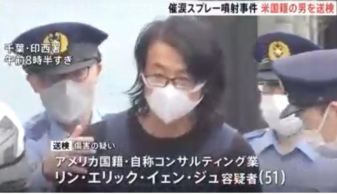 アメリカ国籍の自称コンサルティング業、リン・エリック・イェン・ジュ容疑者(51)は、おととい午後、印西市のイオンモール千葉ニュータウンの駐車場で男性2人に催涙スプレーを噴射し、軽いけがをさせた疑いがもたれています。