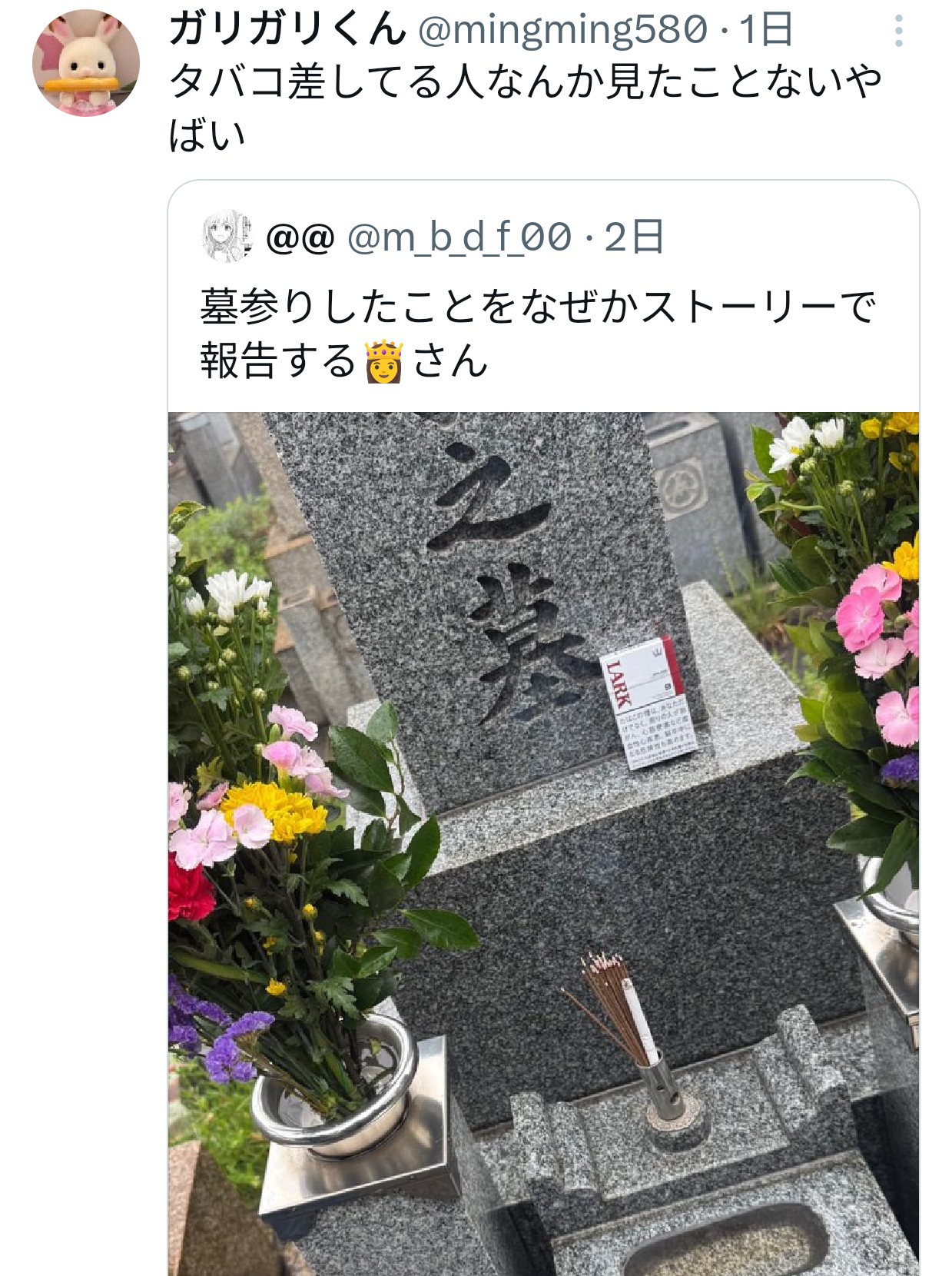 【炎上】キャバ嬢さん、墓参りで墓前にたばこをお供えするも炎上 ←墓参りマウントは流石に草www 2025/5/27 速報 1: これやるよな???? document.write(” + ”); 関連記事 【画像】加藤茶「志村の墓参り行ってきた」(パシャ) ←なんでこんな合成感あるんやろと話題に【pickup】 【画像】加藤茶「志村の墓参り行ってきた」(パシャ) 大物配信者「黙祷や墓参り葬式は意味がないと思ってる」→炎上してる模様 document.write(” + ”); 続きを読む ——— Source: アルファルファモザイク 【炎上】キャバ嬢さん、墓参りで墓前にたばこをお供えするも炎上 ←墓参りマウントは流石に草www