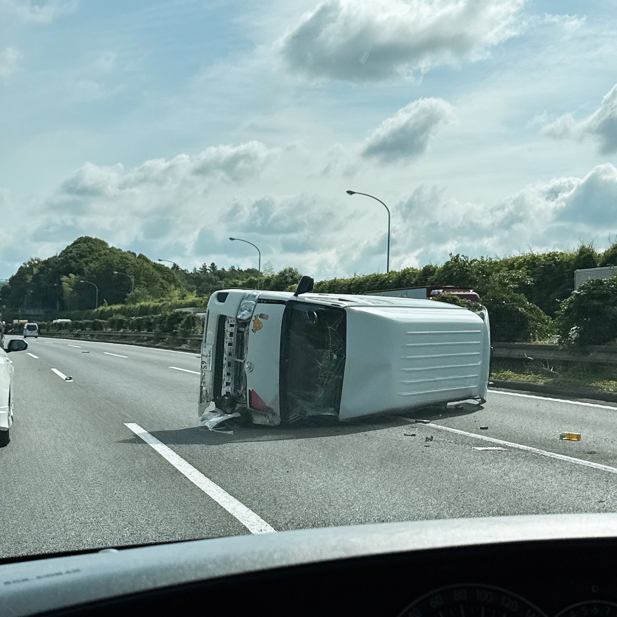 車が横転して道路を塞ぎ2車線規制されている模様