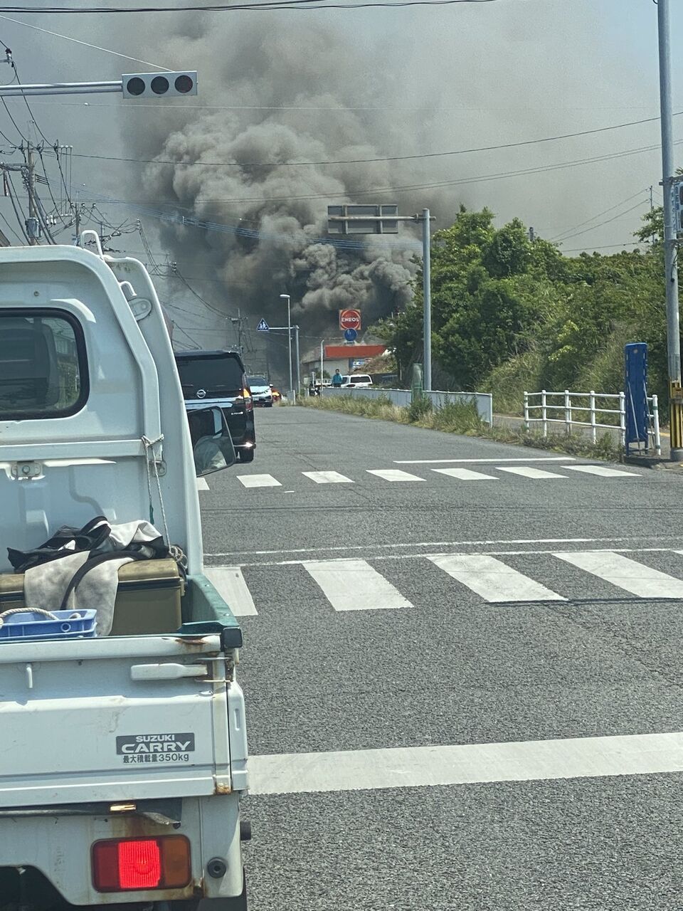 ガソリンスタンドENEOS 長州SS (是永石油)近くの建物から黒煙があがっている模様
