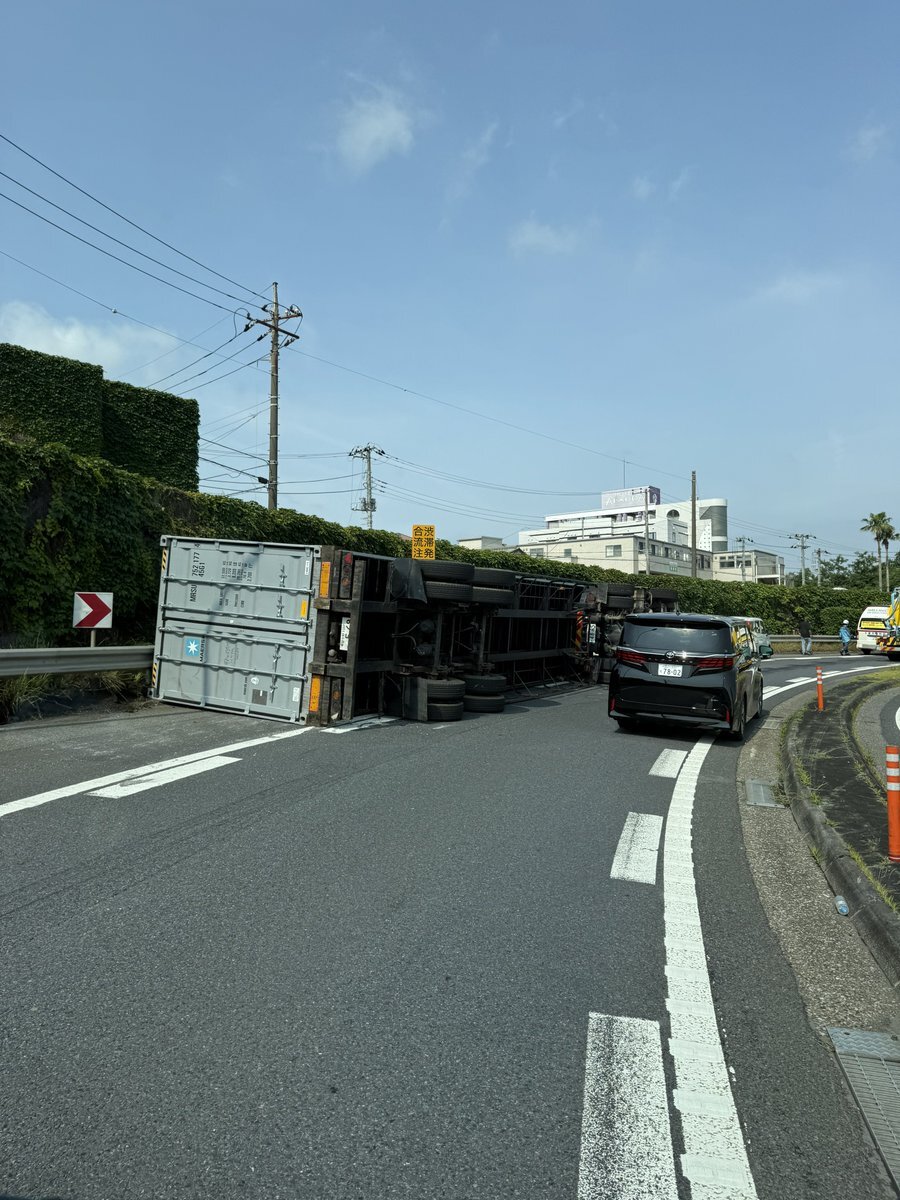 大型トレーラーが横転して道路を塞いでいる模様