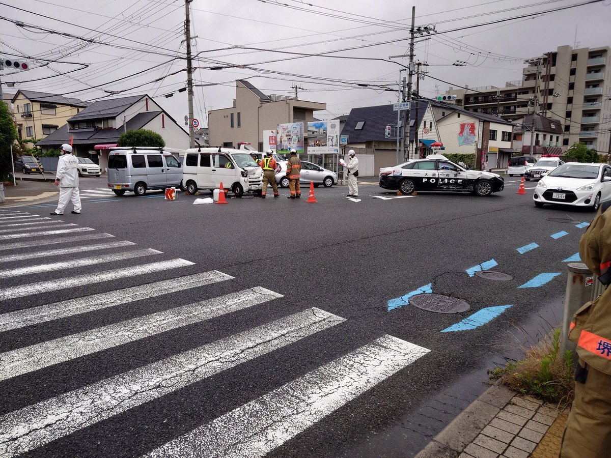 大阪府警パトカーと軽バンが衝突事故し交差点を塞いでいる模様