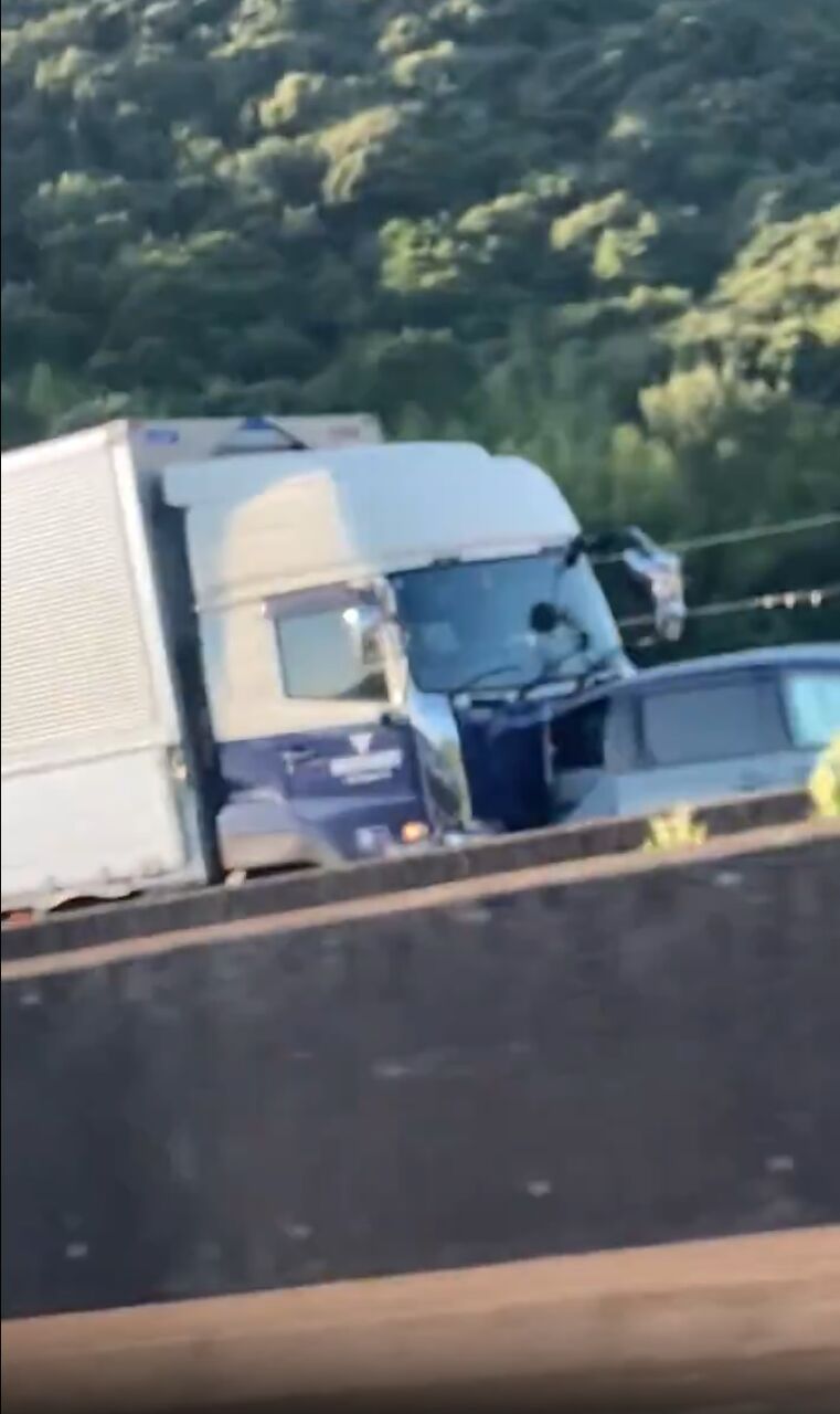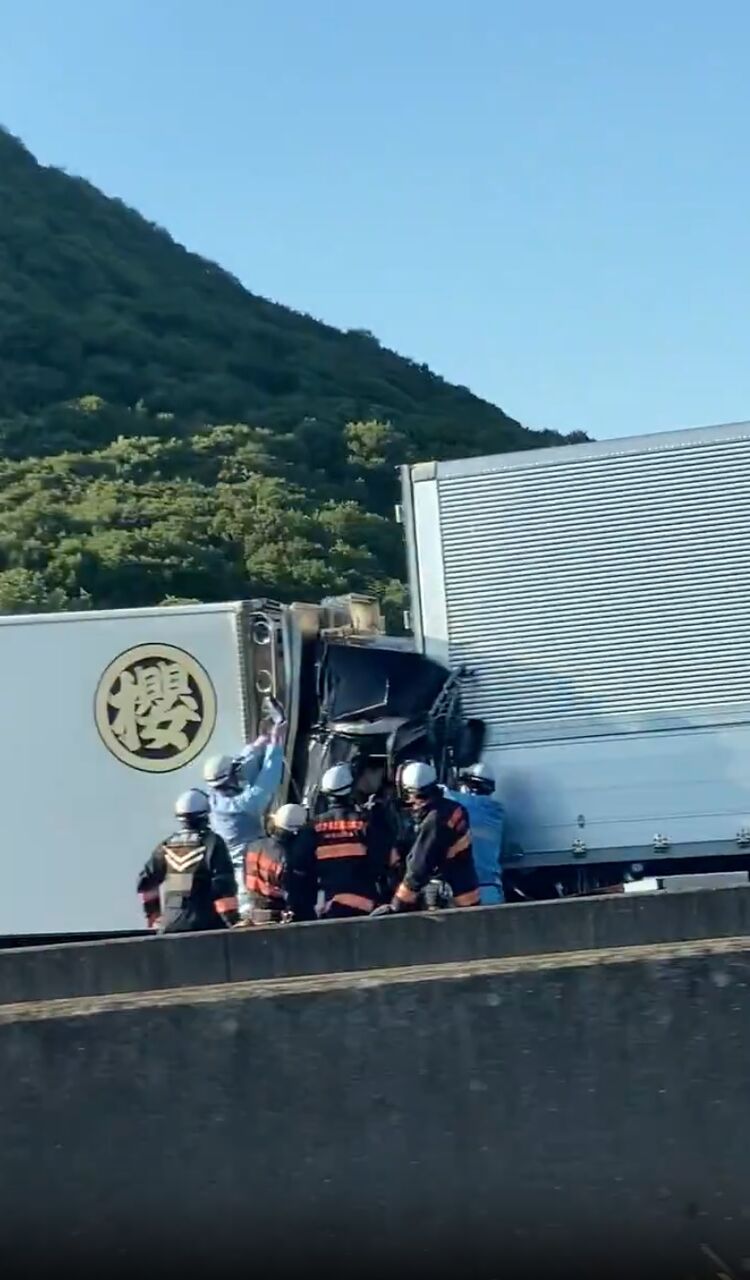 トラック2台含む結構な玉突きしてるトラックキャビンつぶれとる』