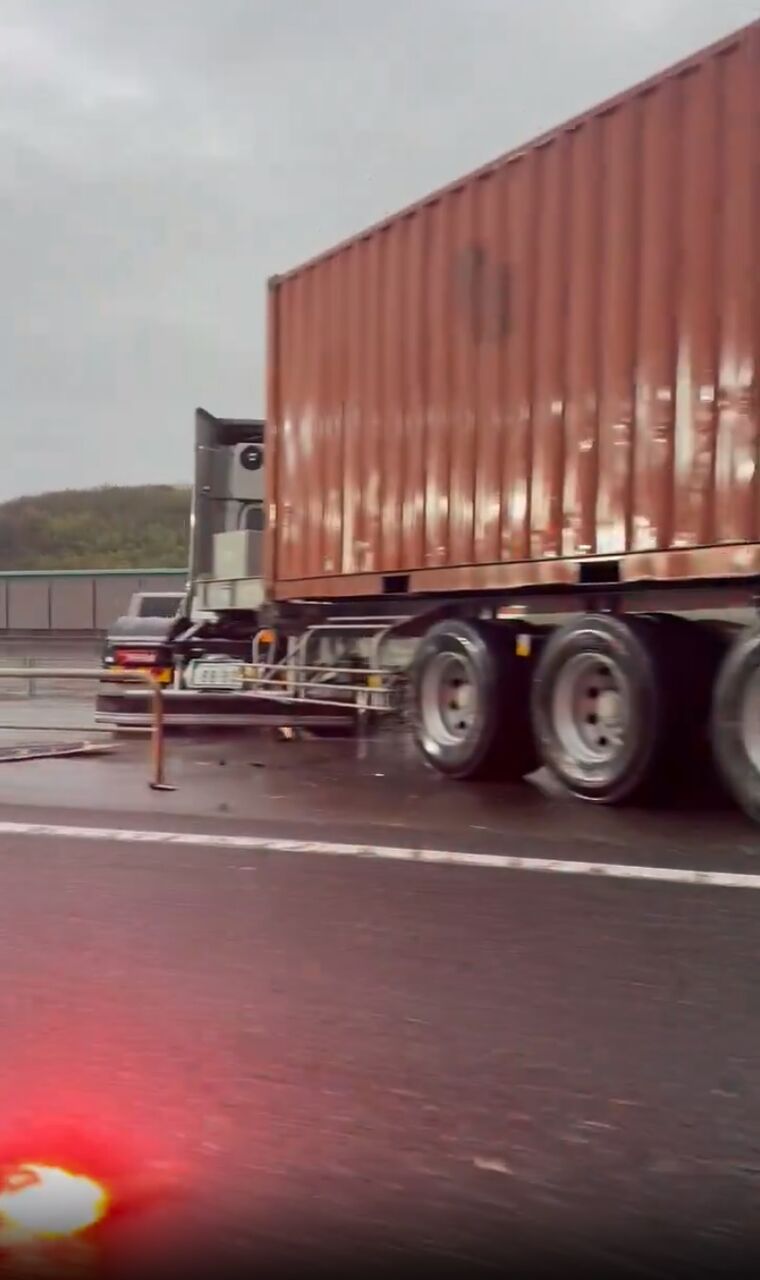 トラックがガードレールを破壊する接触事故していました。かなり渋滞するかもしれません