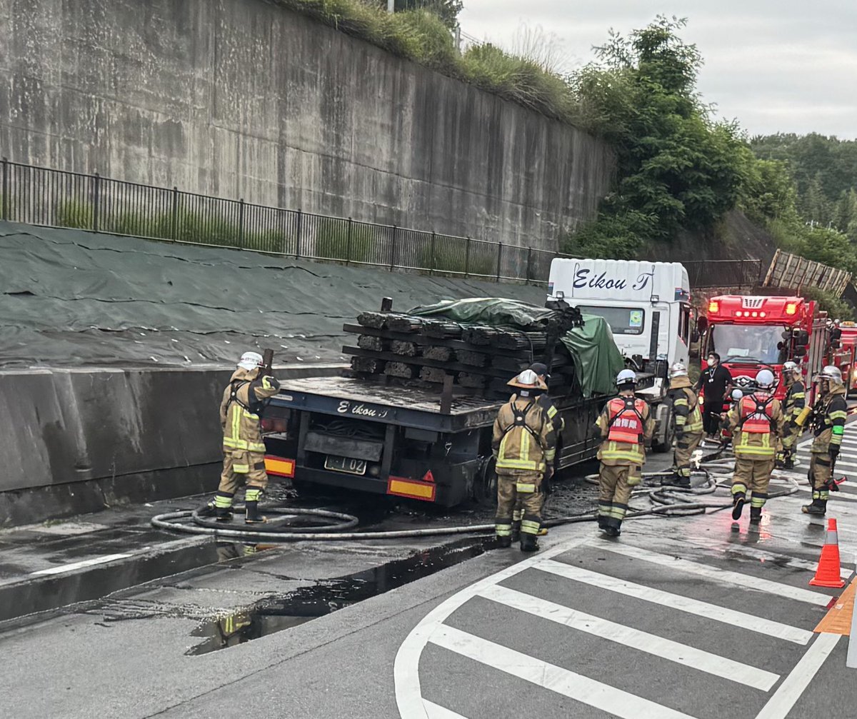 車両火災で通行止めの一報あり現在は片側交互通行に