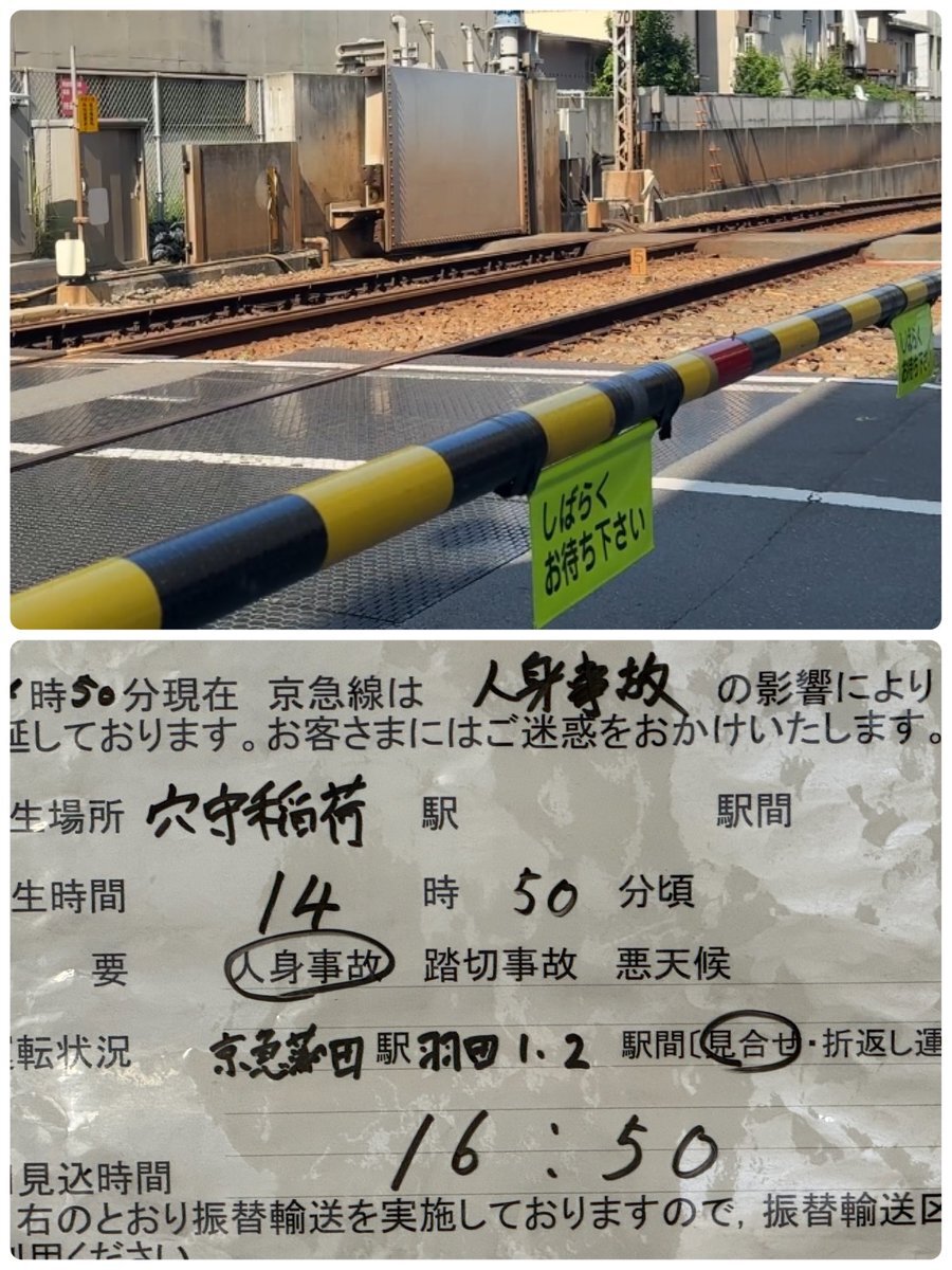 14:54 【運行情報】穴守稲荷駅で発生した人身事故の影響で京急蒲田駅〜羽田空港第1・第2ターミナル駅間の上下線の運転を見合わせ。次の路線にて振替輸送実施中です・・・JR線、東急線、相鉄線、横浜市営地下… #京急 #keikyu https://t.co/djDfAaF69B