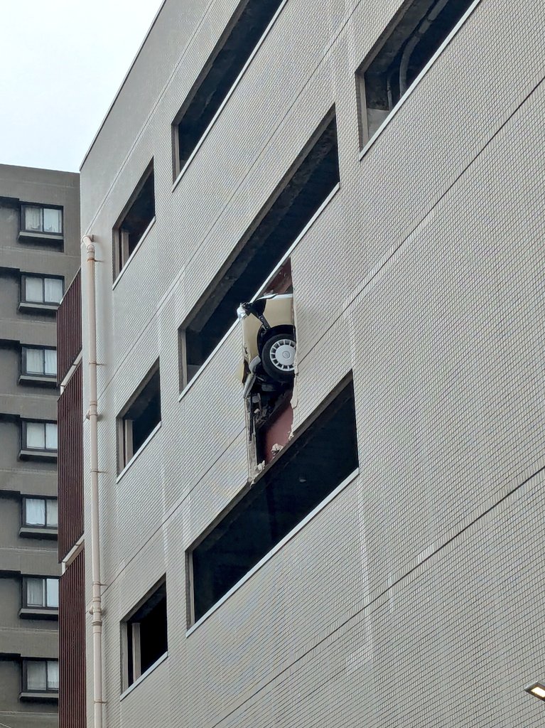【目撃証言】#交通情報 広島県広島市南区段原3丁目付近 パチンコ店「テキサス段原」軽乗用車が立体駐車場の壁を突き破る追突事故 破片が道路に散乱6月24日 #広島 #パチンコ