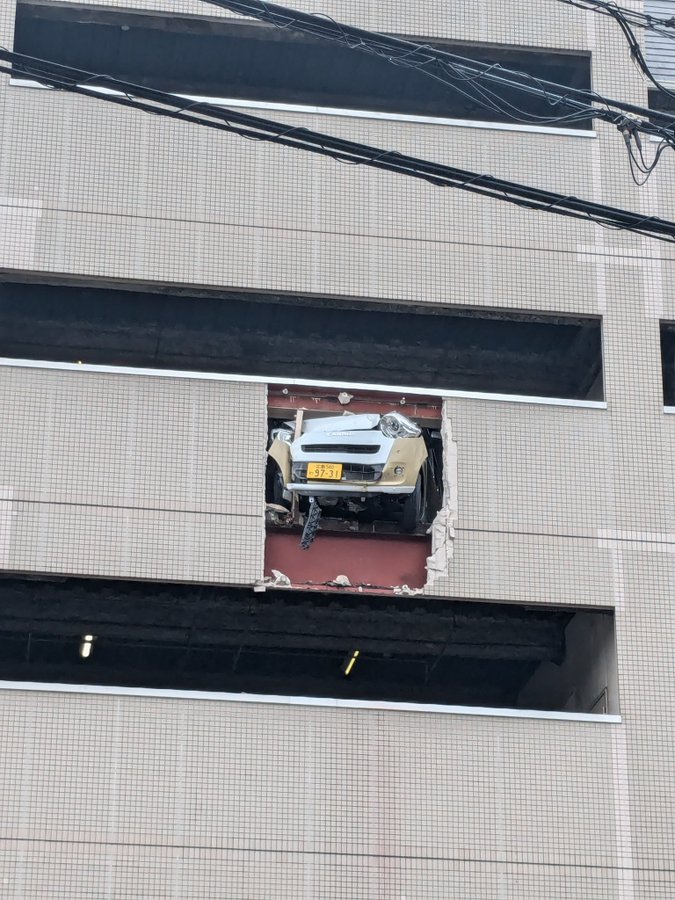 立体駐車場の3階部分で車は、落下の一歩手前で停車したものの、道路にはがれきが散乱し安全確保ために周辺では一時立ち入りが規制されました。