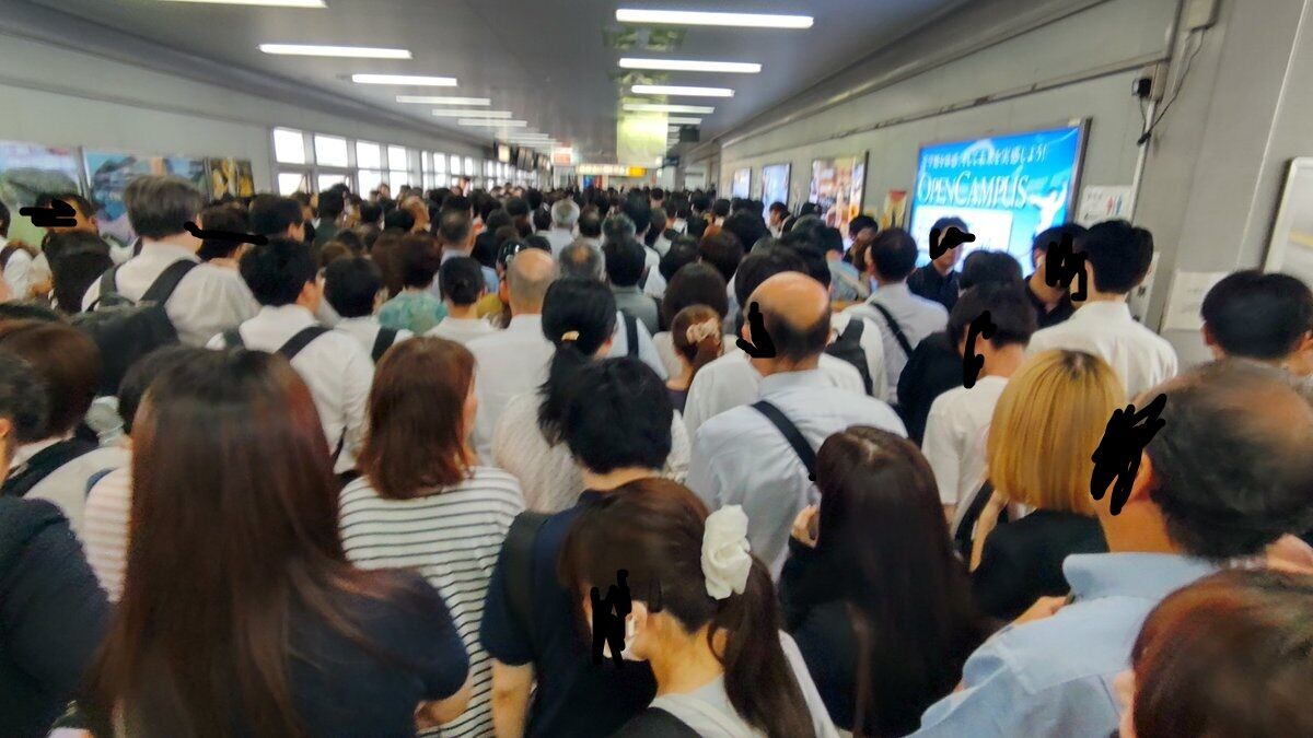 電車から降りたい人もホームにヒト溢れてて降りれないという混み具合