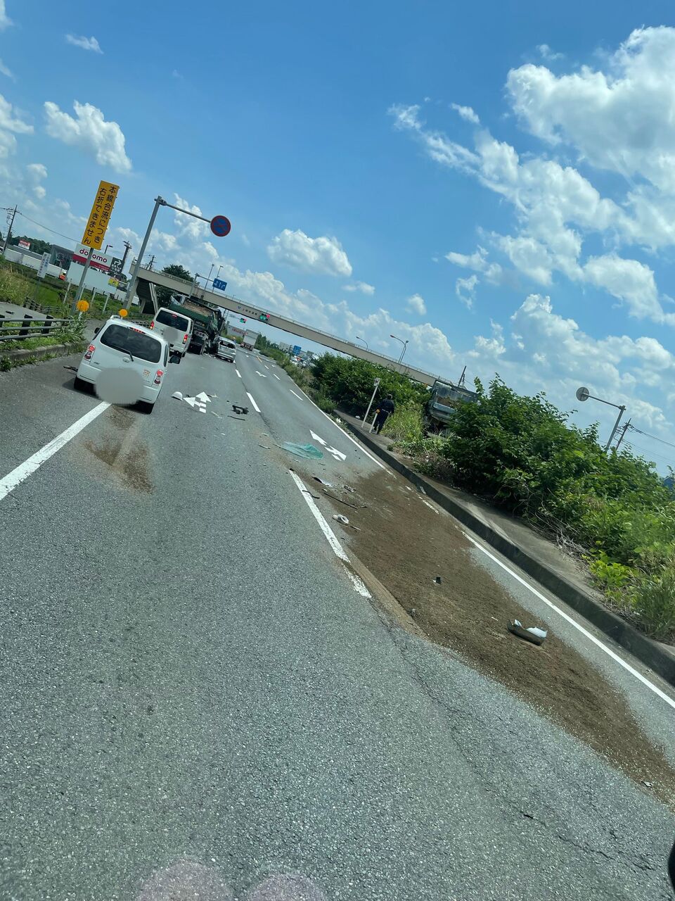 上柳歩道橋付近で大型ダンプと乗用車が衝突し道路に破片と土が散乱している模様
