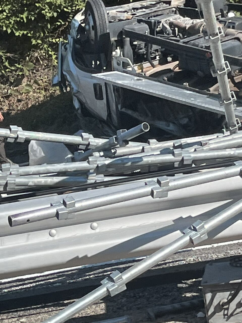 トラックが横転し積荷の工事用足場が道路に散乱している模様