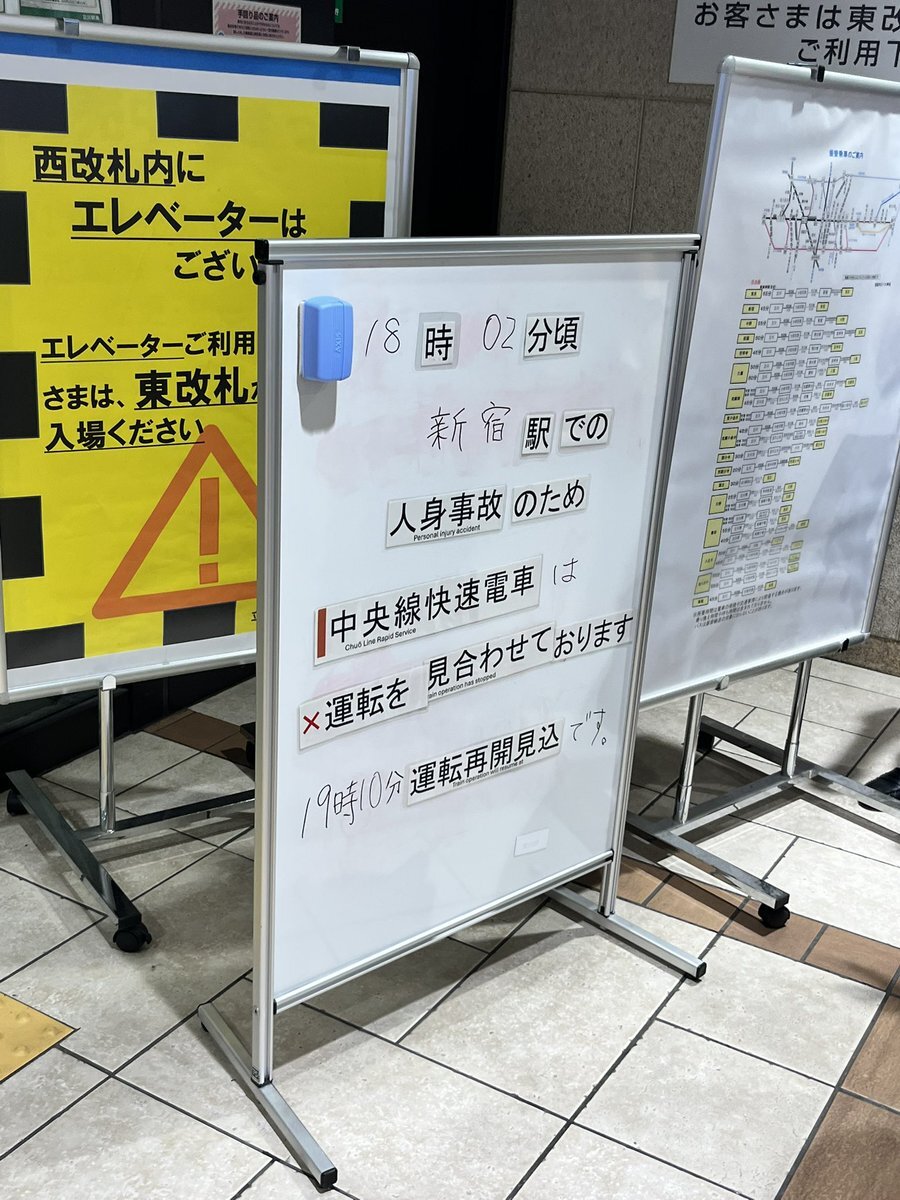 中央線快速電車は、新宿駅での人身事故の影響で、上下線で運転を見合わせています。運転再開は19時10分頃を見込んでいます。 #中央線快速電車 #Chuo_Line https://t.co/Bw82N3lIYZ— JR東日本【中央方面】運行情報 (公式) (@JRE_F_Chuo) June 30, 2025