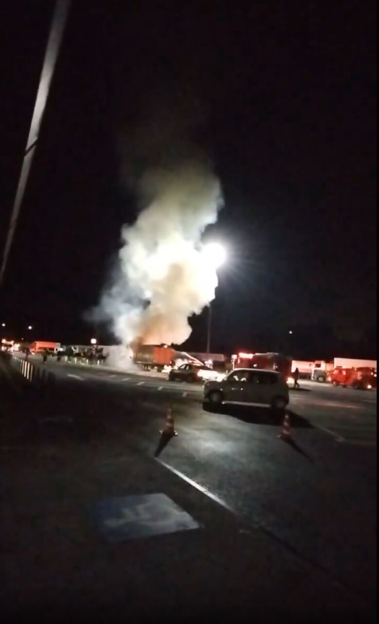 サービスエリア内でトラックから炎と煙があがっている模様