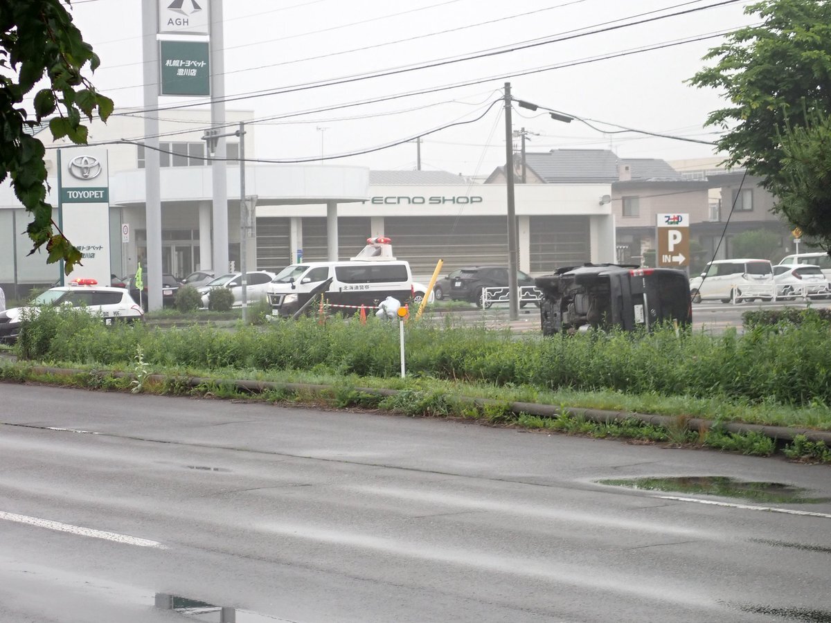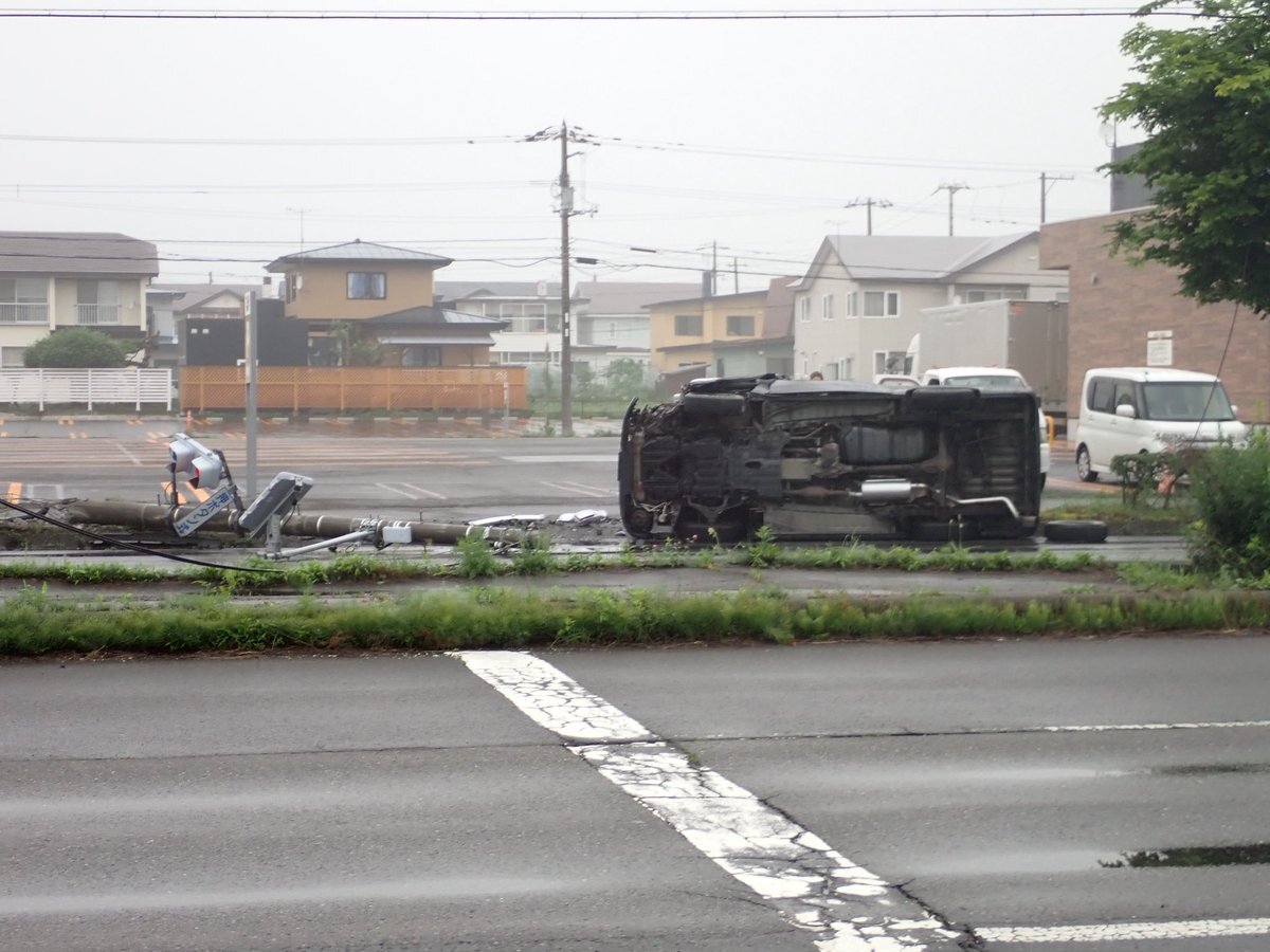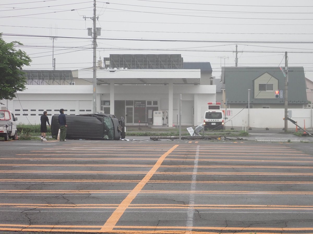 『苫小牧フードD澄川店の前で事故が。ワンボックスが横転し、信号が倒されていました。片側が通行止めに。』