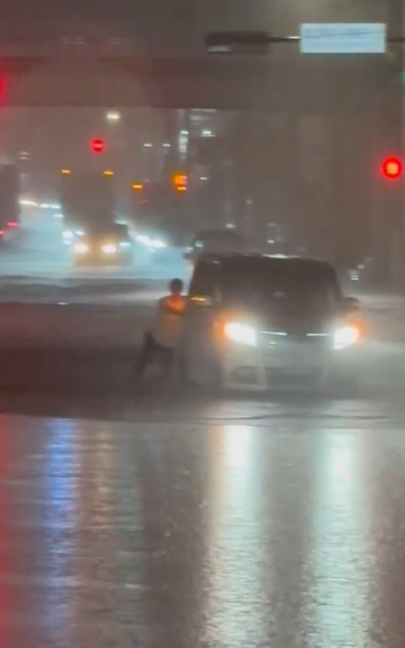 道路冠水してて手押し車してる人いた、雨えぐすぎ、初めてだよ
