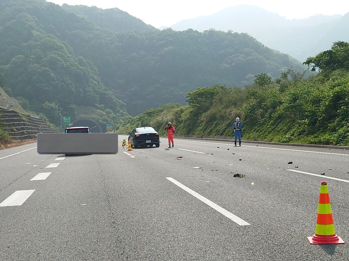 乗用車の事故で部品破片が広範囲に散乱している模様
