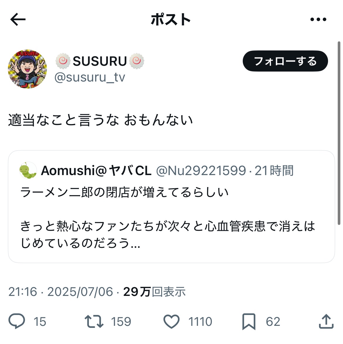 【悲報】ラーメンユーチューバーSUSURUさん、ブチギレ 2025/7/8 速報 1: ヒェッ… https://x.com/susuru_tv/status/1941833518759510056 document.write(” + ”); 関連記事 【衝撃】ラーメンユーチューバーSUSURU、重大発表。 【悲報】六年間毎日ラーメン食ってたsusuruTVさんの健康診断 document.write(” + ”); 続きを読む ——— Source: アルファルファモザイク 【悲報】ラーメンユーチューバーSUSURUさん、ブチギレ