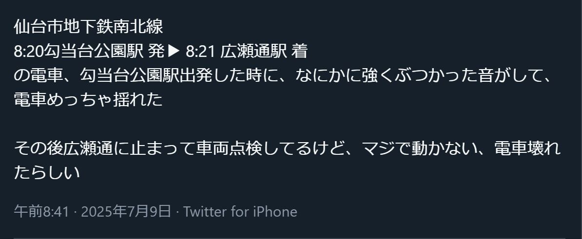 『勾当台公園駅出発した時に、なにかに強くぶつかった音がして、電車めっちゃ揺れた