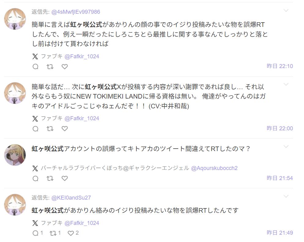 【悲報】ラブライブ公式アカウント、鬼頭明里批判ツイートを誤リポストwwwwwwww 2025/7/9 速報 1: リポストしたツイート 炎上 document.write(” + ”); 関連記事 【速報】推しクレカ炎上騒動のラブライブ声優さん、とんでもない事になってしまう 【画像】万博×ラブライブコラボ、我々の想像を超えてくるwwwwwwwwwwwwwwwwwwwwwwwww 【悲報】ラブライブ映画、絵柄変更しまくって大迷走中wwwwwwww 【画像】ラブライブ声優「え!?私がチャイナドレス着るんですか!?」 【画像】ラブライブ声優の菅叶和さんXアカウントを乗っ取られた件、ヤバすぎる模様wwww document.write(” + ”); 続きを読む ——— Source: アルファルファモザイク 【悲報】ラブライブ公式アカウント、鬼頭明里批判ツイートを誤リポストwwwwwwww