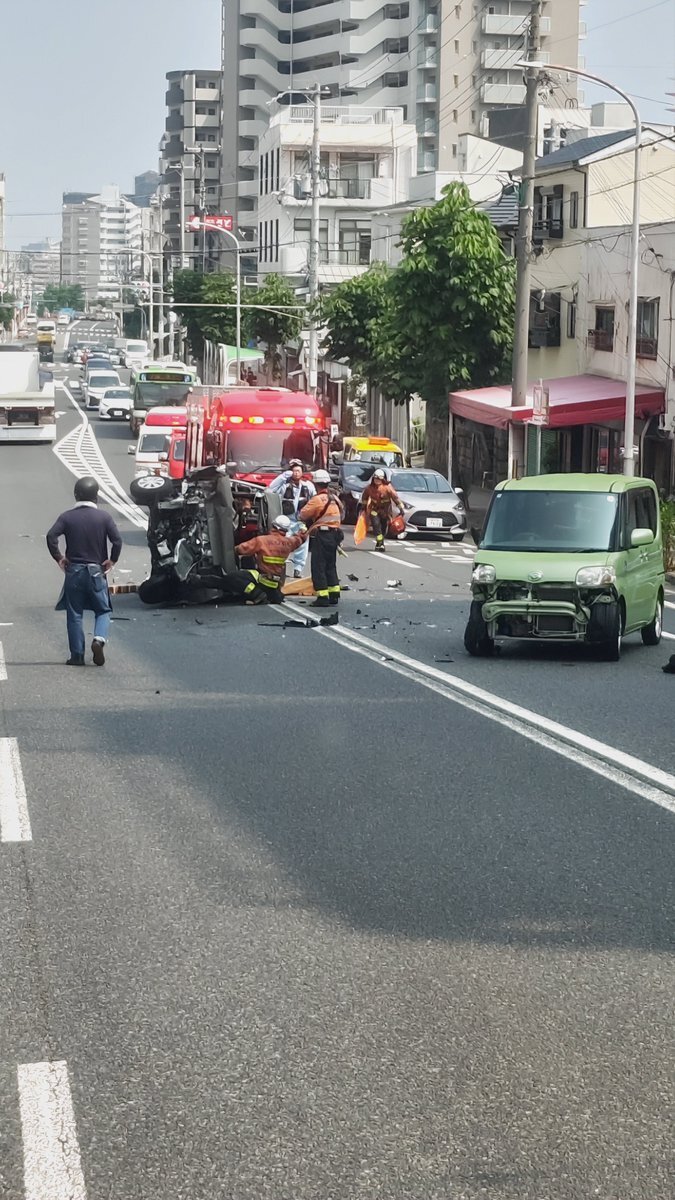 【現場の様子】#交通情報 湊町線 兵庫県神戸市兵庫区湊川町5丁目付近 車線塞ぐ衝突横転事故で交通規制渋滞7月9日 #神戸 #湊川