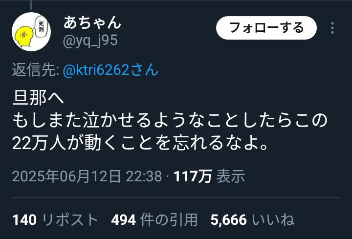 【悲報】X女さん、憎い旦那への大喜利で盛り上がってしまう 2025/7/10 速報 1: 日本女ヤバすぎでしょ… document.write(” + ”); 関連記事 旦那デスノートでおなじみの不凍液を夫に飲ませた女性回復不能な末期慢性腎不全を引き起こさせても、涙を流せば執行猶予になるのすごい 【HotTweets】 【悲報】女さん「イラッとしたから旦那が風呂入ったタイミングで洗い物始めたわざまぁ!」←絶賛の嵐 【動画】磯野貴理子(55)「旦那(31)から子供欲しいって言われたから離婚してあげた(笑)」 【画像】旦那「制服でしようよw」嫁「えー、もーやだぁ笑♡」 → 【悲報】旦那デスノートを参考にした奥様の末路 document.write(” + ”); 続きを読む ——— Source: アルファルファモザイク 【悲報】X女さん、憎い旦那への大喜利で盛り上がってしまう