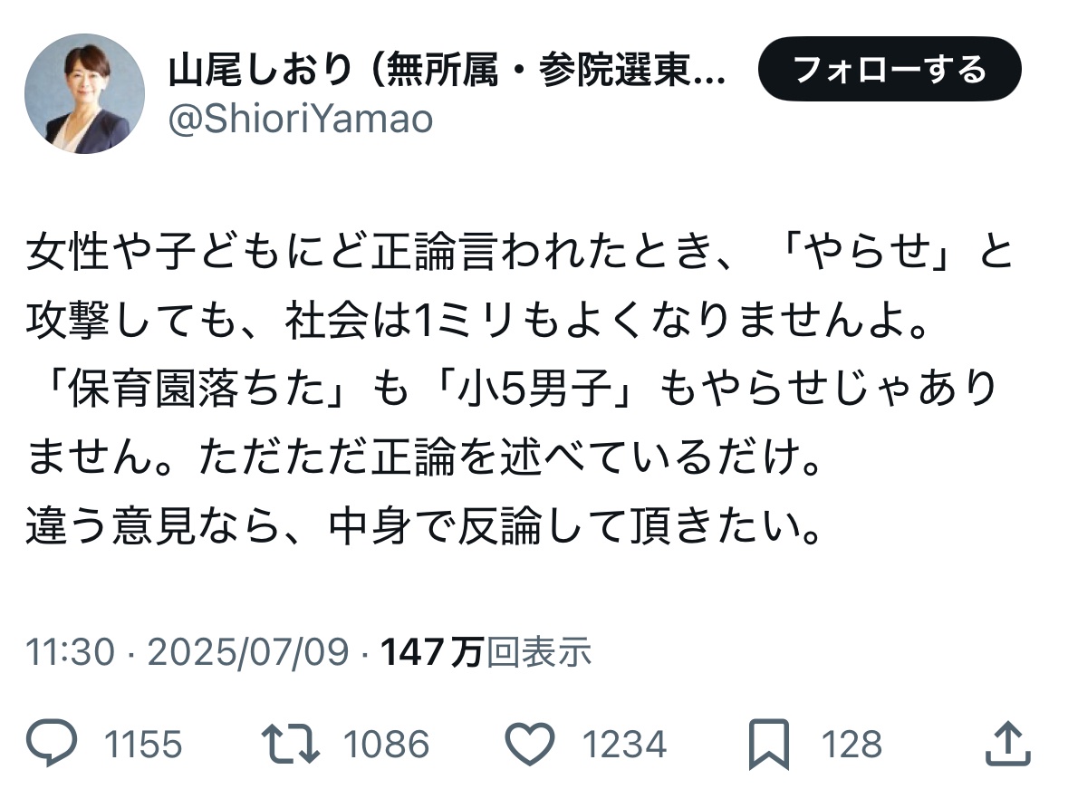 山尾志桜里、反撃開始。 2025/7/11 速報 1: document.write(” + ”); 関連記事 【悲報】山尾しおりさん、例のポスト削除してしまうwwwwwwwwww 【画像】山尾しおりさん、嘘松疑惑で炎上してしまうwwwww 山尾志桜里さん、無所属で参院選に出馬 【画像】15年前くらいの山尾志桜里さんwwwww 【悲報】山尾志桜里「もう全部言うわ」ブチギレ大暴露 document.write(” + ”); 続きを読む ——— Source: アルファルファモザイク 山尾志桜里、反撃開始。