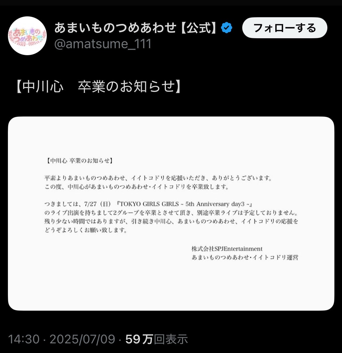 【画像】人気地下アイドルさん、事務所に勝手に卒業発表されて揉めてしまう 2025/7/12 速報 1: ・運営が複数グループ兼任の人気メンの卒業を突然発表 ↓ ・メンバー本人も理由を聞いておらず事実上の解雇処分 ↓ ・メンバーは解雇にあたるような事をした覚えがないと潔白を主張 ↓ ・弁護士を立てて争う可能性に言及 document.write(” + ”); 関連記事 【画像】陰好みの地下アイドルが発掘され陰界騒然wwwwwwwwww【pickup】 【画像】陰好みの地下アイドルが発掘され陰界騒然 【動画】最近の地下アイドル、サービスが過剰過ぎるwwwww 【動画】最近の地下アイドルのライブがこちらですwwwwwwwwww 【画像】地下アイドルさん下品すぎて炎上。。。 document.write(” + ”); 続きを読む ——— Source: アルファルファモザイク 【画像】人気地下アイドルさん、事務所に勝手に卒業発表されて揉めてしまう