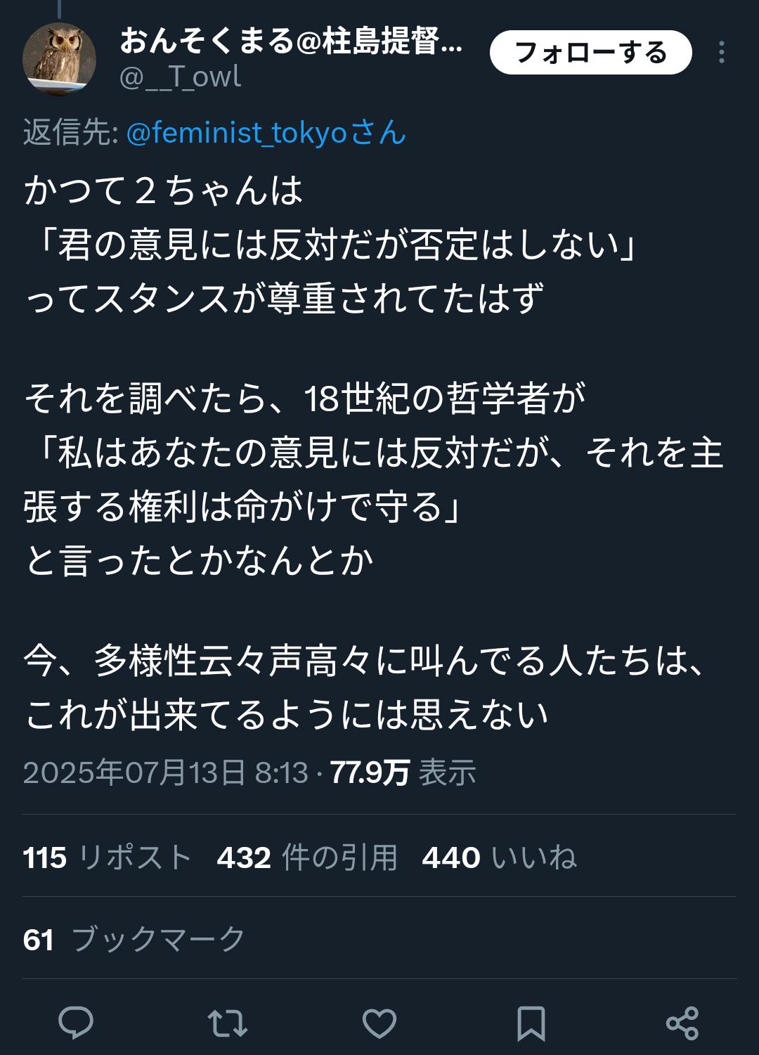 【画像】ネット民「かつて2ちゃんは「君の意見には反対だが否定はしない」ってスタンスが尊重されてたはず」 2025/7/15 速報 1: そんな時代あったか? https://x.com/__T_owl/status/1944173337548402990 document.write(” + ”); 関連記事 【悲報】京アニ青葉「2ちゃんねるで荒らしをしていて有名だったが、管理人に直々に怒られたことがあります」 【速報】ツイッターに2ちゃんの有名AAを作ったのは自分だと名乗る人物が現れる 【速報】藤田ニコルさん、2ちゃんねらーだった document.write(” + ”); 続きを読む ——— Source: アルファルファモザイク 【画像】ネット民「かつて2ちゃんは「君の意見には反対だが否定はしない」ってスタンスが尊重されてたはず」