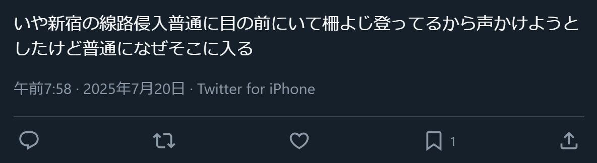 『いや新宿の線路侵入普通に目の前にいて柵よじ登ってるから声かけようとしたけど普通になぜそこに入る』