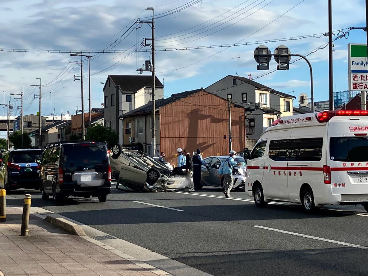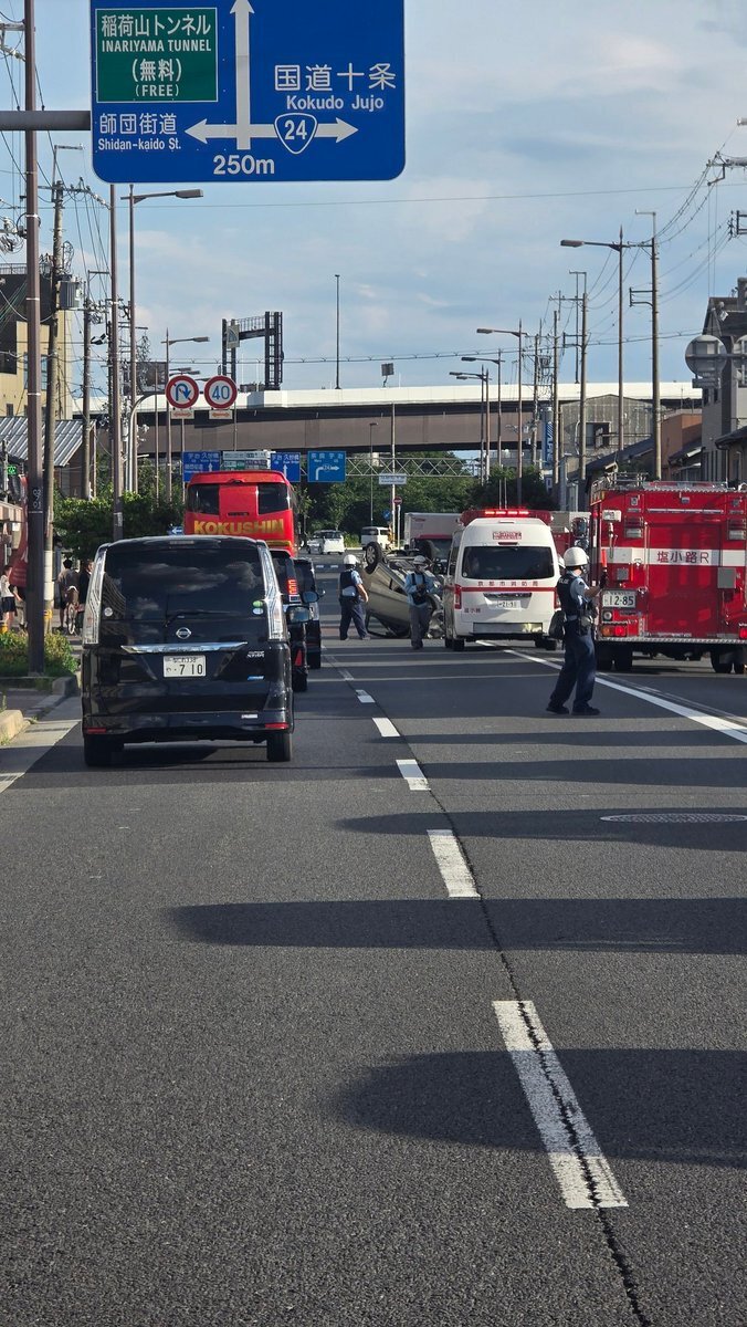 『河原町十条北行きファミマ前で車両横転事故 ほやほやなのでこれから渋滞しますよ〜』